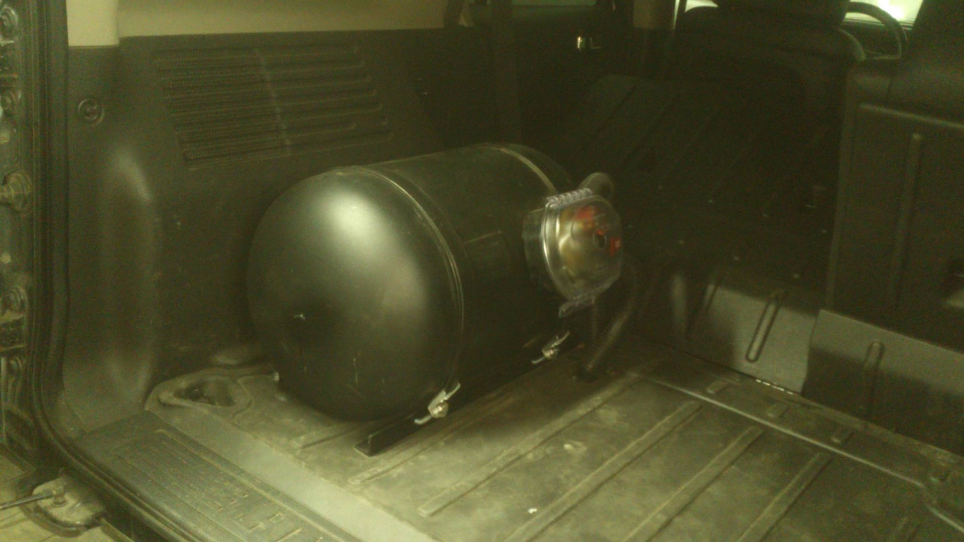 Баллон…мда, не баллон а цилиндр! Цилиндр на 50л от компании Атикер установили в левой стороне багажника. В дальнейшем после переделки выхлопной системы появиться еще одна емкость или под днищем со стороны пассажира или.вообщем посмотрим.