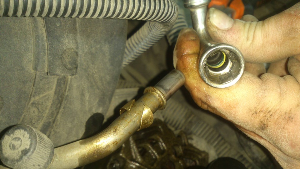 Далее, снимаем топливную магистраль. Повезет тем кто занимается кондиционерами, у этих ребят есть специальные съемники. Мы же соорудили нечто подобное из зажимного колечка.
