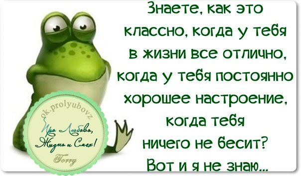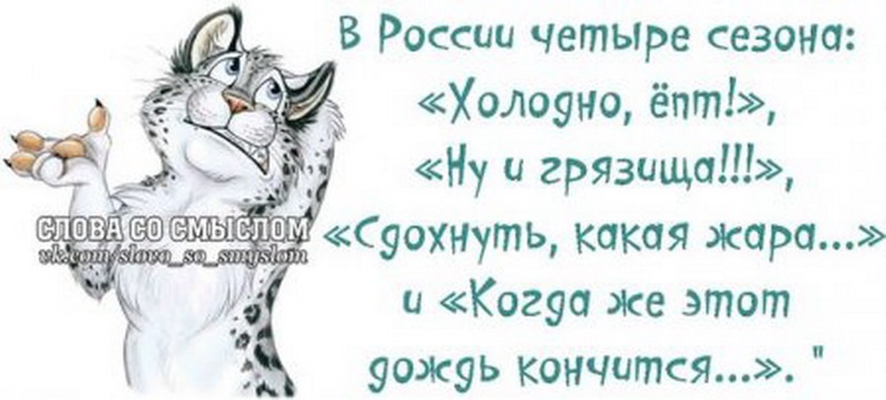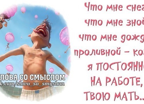 1) "скоро рассвет, выхода нет, ключ поверни и полетели" просто хорошая песня. всем здоровья, чтобы не чихать 2) все будет, но не сразу. из серии "к следующему лету точно накачаюсь" 3) спааакойствие, только спааакойствие. все проходит. 4) главное — душа. наверное… 5) все хорошо, прекрасная маркиза, все хорошо, все хорошо. 6) стабильность одобряет сам ВВП 7) деньги — навоз, сегодня нет, а завтра воз. вот только когда оно наконец наступит, это завтра 8) овощи полезны, говорят. витамины, клетчатка, тоси-боси, трали-вали. антошка, антошка, пойдем копать картошку. 9) неправда, говорят, провинившийся муж гораздо полезнее. хотя мне откуда знать. 10) я мог бы выпить море, я мог бы стать другим… вечно молодым… вечно пьяным… еще одна просто хорошая песня. 11) не так: грязь засохла и грязь замерзла. а на Урале вообще лето короткое, зато малоснежное. 12) а мой начальник — не тряпка. настоящий бизон. 13) даже если вас послали, чувствуйте себя важным посланником 14) люби себя, чихай на всех, и в жизни ждет тебя успех. 15) я сошла с ума, я сошла с ума, мне нужна она, мне нужна она, я сошла с ума 16) поделись улыбкою своей 17) ну-ну, зато потом будет сорок котов годам к сорока. впрочем это личное дело 18) счастье всем, даром, и пусть никто не уйдет обиженным!