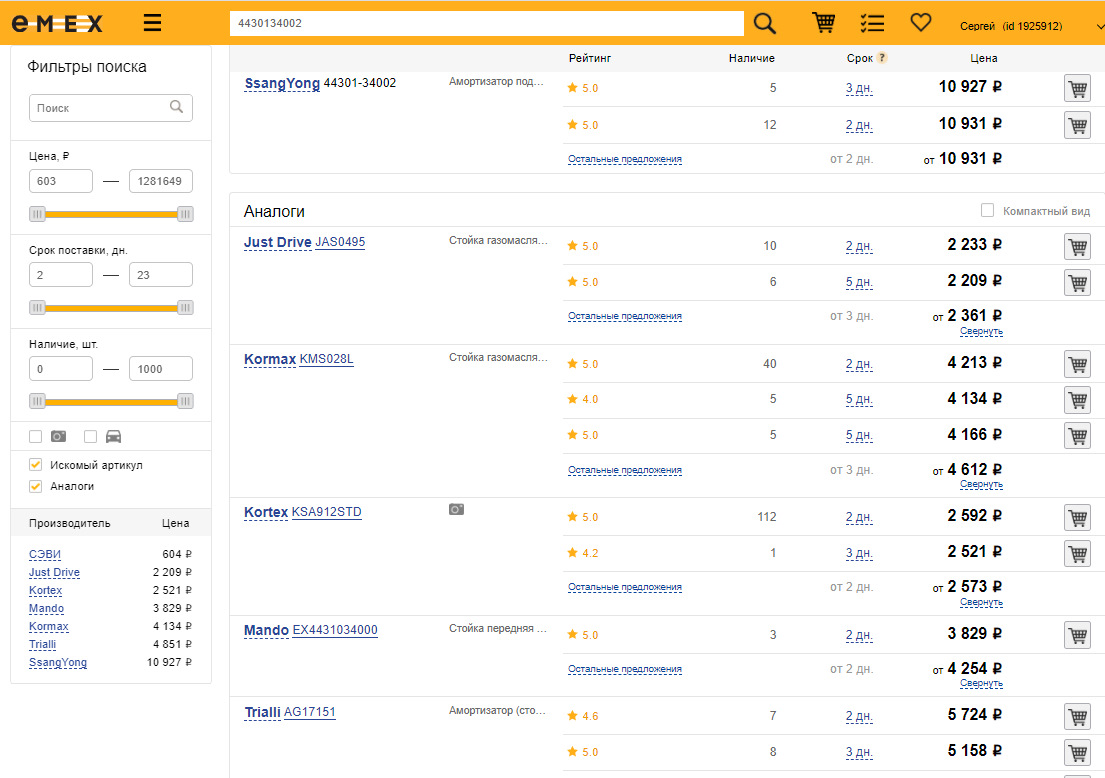 Что покупать решайте сами. Я как всегда воздержусь от конкретных указаний. Мое дело рассказать Вам правду – кто есть кто на самом деле. Мое дело убрать в сторону красивые сказки брендов для покупателей…А для примера привожу цены на амортизатор передний Акцента в порядке возрастания на №5465025150 ( информация с Эмекса. Цены только по позициям с большим количеством остатков, а не одинокого товара, оставшегося случайно под прилавком в штучном экземпляре и по старым курсам валют):
