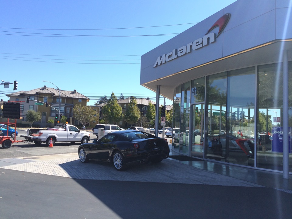 И только здесь можно встретить Ferrari, припаркованную возле салона McLaren.
