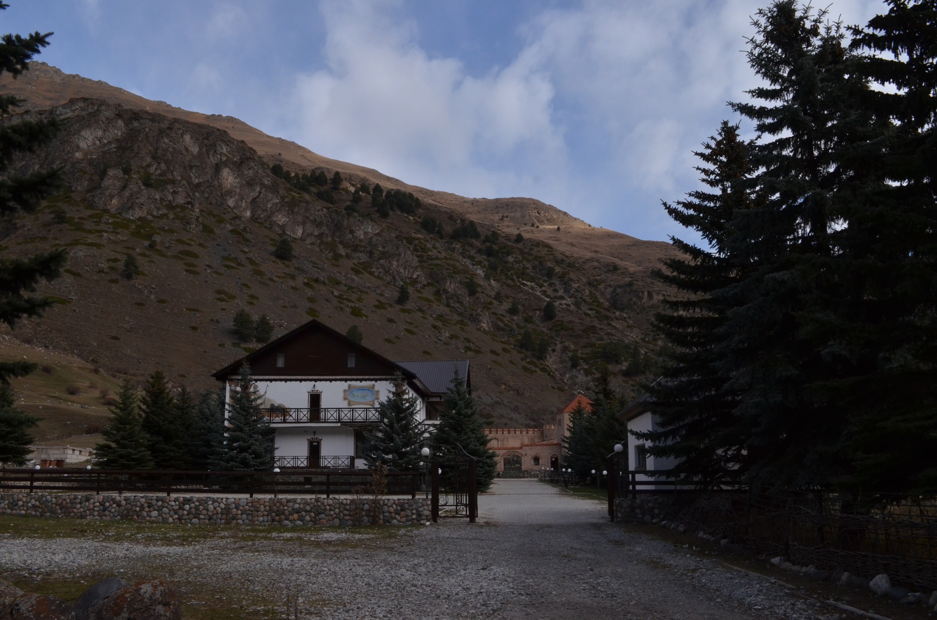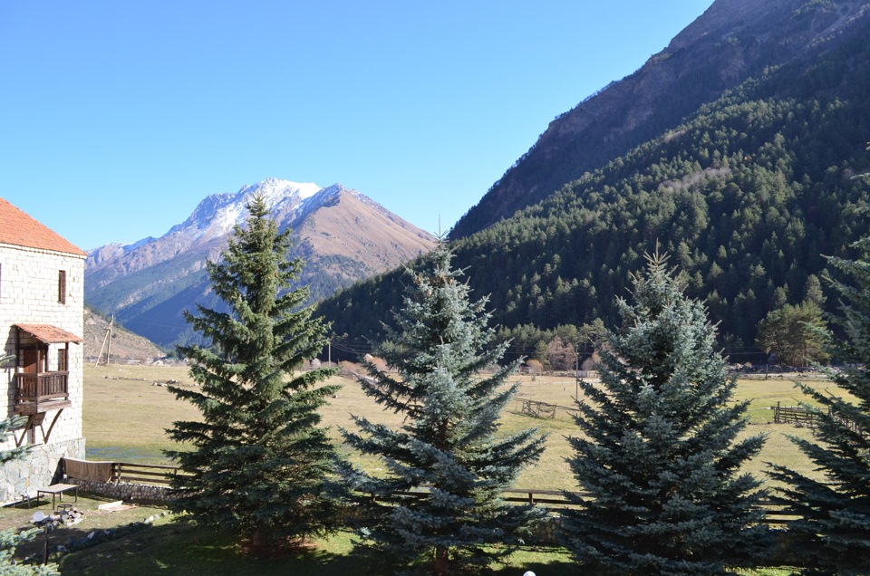 Проснулись прямо к завтраку. На день мы запланировали прогулку по окрестным местам. Взобраться на небольшую гору и найти магазин и аптеку. Но сначала нас ждал завтрак") Придя в ресторан и сев за уже накрытый стол, мы были слегка разочарованы содержимым: небольшая порция творога со сметаной, стакан кефира, несколько кусочков домашнего хлеба и чайник чая, но после того как мы приступили к трапезе, нам принесли по тарелке овсяной каши с маслом, вареные яйца и горячие блины с сыром, которые как мы позже узнали называются хычины. Хычины были гигантские, а т.к. много я не ем, у мужа был царский завтрак") Кстати сказать, кормят там очень вкусно, вкусно и натурально, всё очень свежее и домашнее. Завтрака хватило до самого ужина.