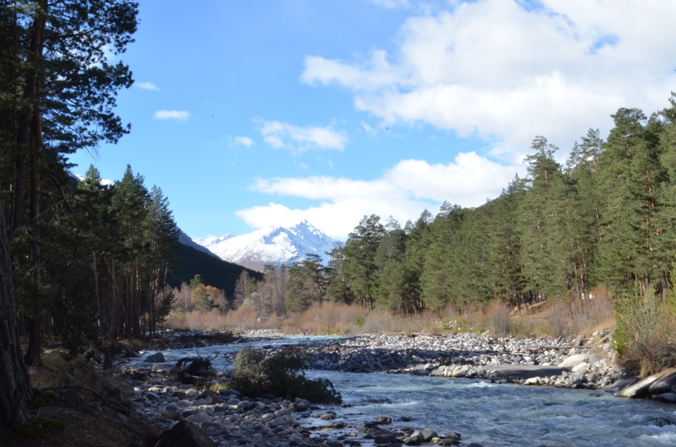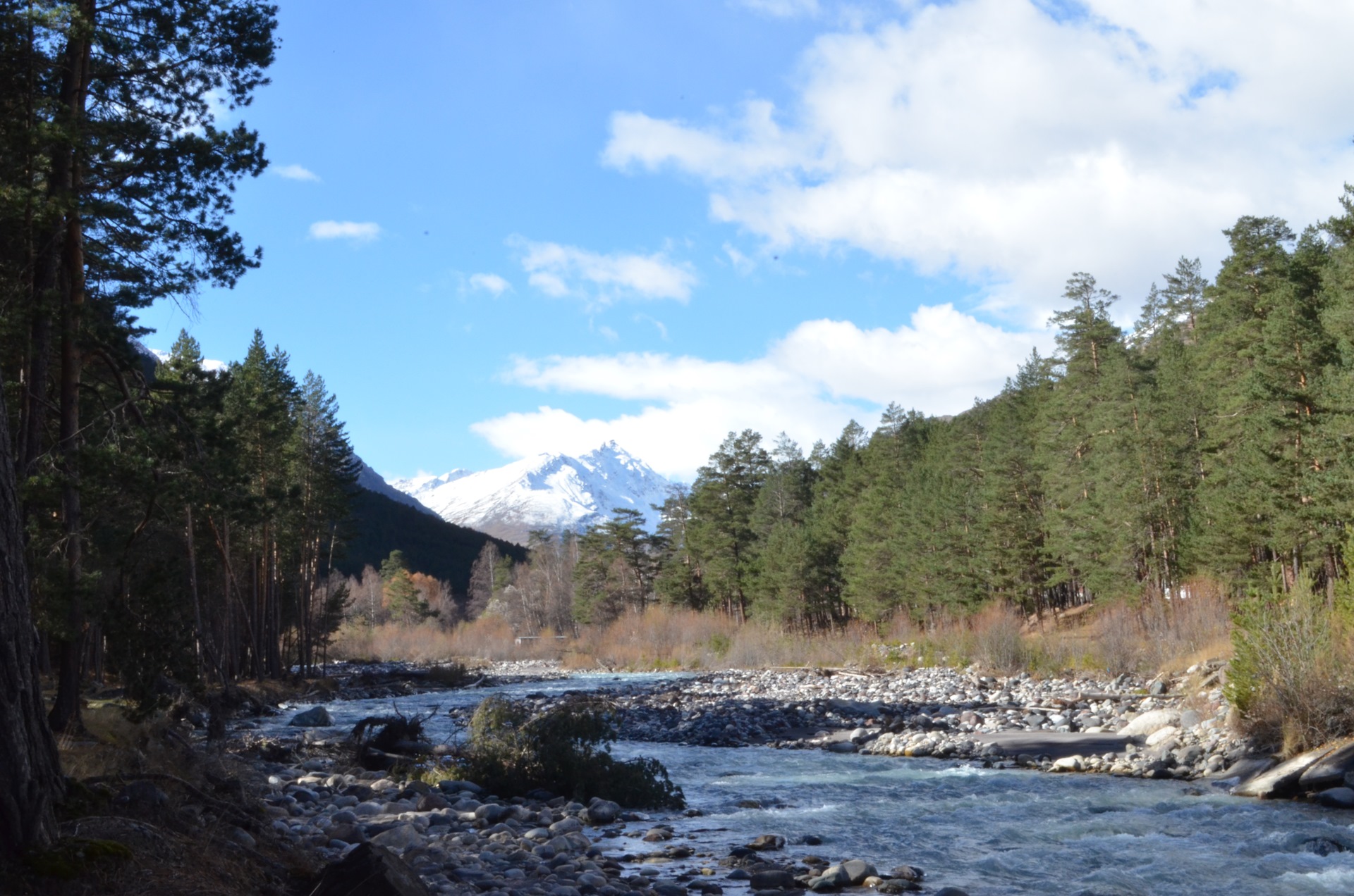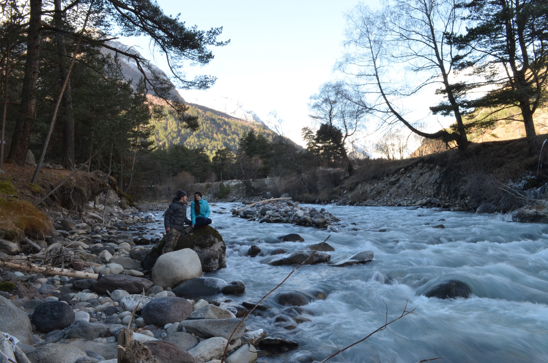 Далее прогулка по Баксанскому ущелью вдоль реки Баксан. Река очень красивая. Настоящая бурная горная речка. Вода ледяная и кое где уже лед.