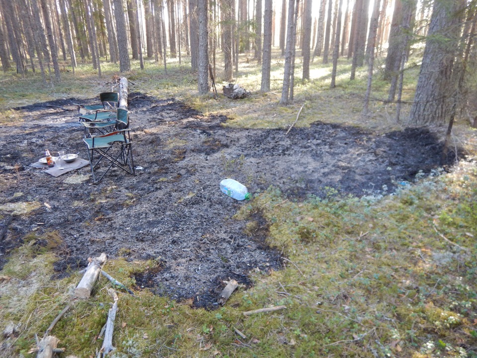 09.05.2016 мы покинули Архангельскую область и на прощание решили заехать в любимый уголок Вологодской области — Устюженский район, на закрытие весенней охоты. Тащить лагерь на остров было лень и мы стали лагерем в лесу. Опасность я почувствовал, едва ступил на лесную подложку. Ягель и мох пересох до состояния с треском ломающегося трута. С учётом этого, место для костра было выбрано в колее лесной дорожки, кроме того, тщательно окопано.