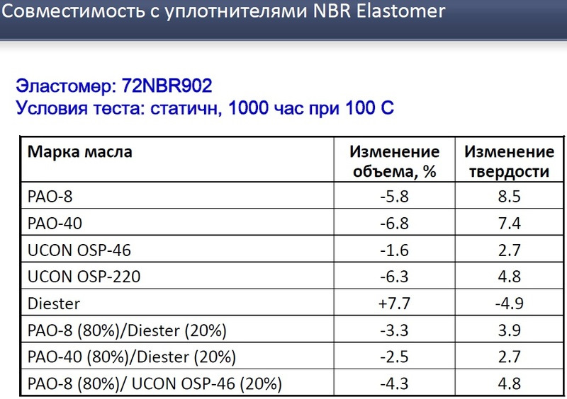 Недостатком диэфирных синтетических масел является их повышенная агрессивность в отношении натуральных и синтетических резинотехнических изделий. Они вызывают "НАБУХАНИЕ" и "РАЗМЯГЧЕНИЕ" резиновых прокладок, сальников и т.п. В теории, данный недостаток способно нивелировать добавление ПАО-(Полиальфаолефины), (а в нашем случае наличие ПАО в исходном продукте для смешивания), что должно компенсировать воздействие Эстеров на эластомеры (резиновые изделия) и наоборот, тк. наличие ПАО основы в масле, "СУШАТ", т.е. вызывают усадку резиновых уплотнений с потерей их эластичности, а также худшую, по сравнению с минеральными маслами, растворяющую способность по отношению к некоторым типам присадок, данные недостатки компенсируются добавлением небольшого количества сложных эфиров — Эстеров. То есть данные основы являются взаимодополняющими друг друга. В качестве приложения выкладываю результаты испытаний, правда из исследования посвященного другому сложному эфиру — масло растворимому ПАГ «Оil soluble polyalkylene glycol» — OSP PAG.