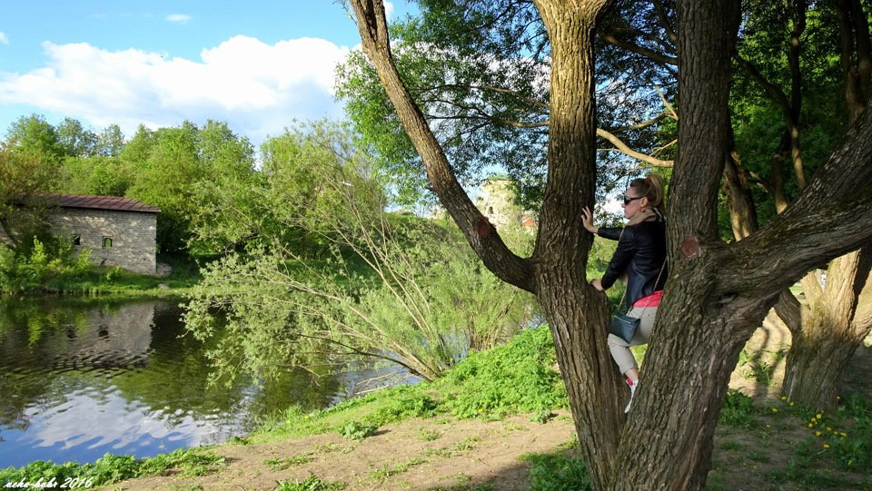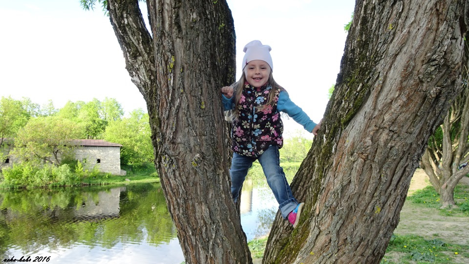 так любит дочь по деревьям лазить, что ели удается стащить ее вниз с дерева…)