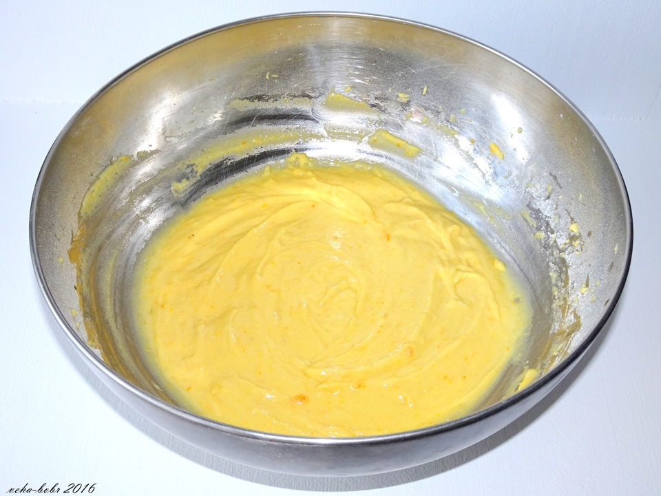 из мандарина если есть вытащить косточки, чистить не нужно, разрезать на несколько частей и измельчить блендером… куриные яйца взбить с сахаром, добавить растительное масло и снова взбить миксером, добавить мандарин который измельчили блендером и снова взбить миксером тесто, далее добавить муку, разрыхлитель и ванилин и все взбить миксером…