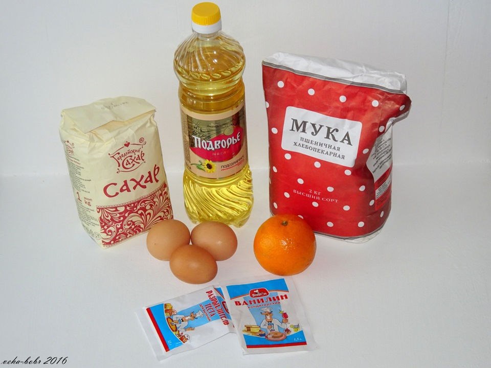 для приготовления кексов понадобится: мука 350 гр., сахарный песок стакан, 3 куриных яйца, растительного масла 150 мл., разрыхлителя для теста 1 ч. ложка, ванилин по вкусу и 1 мандарин…