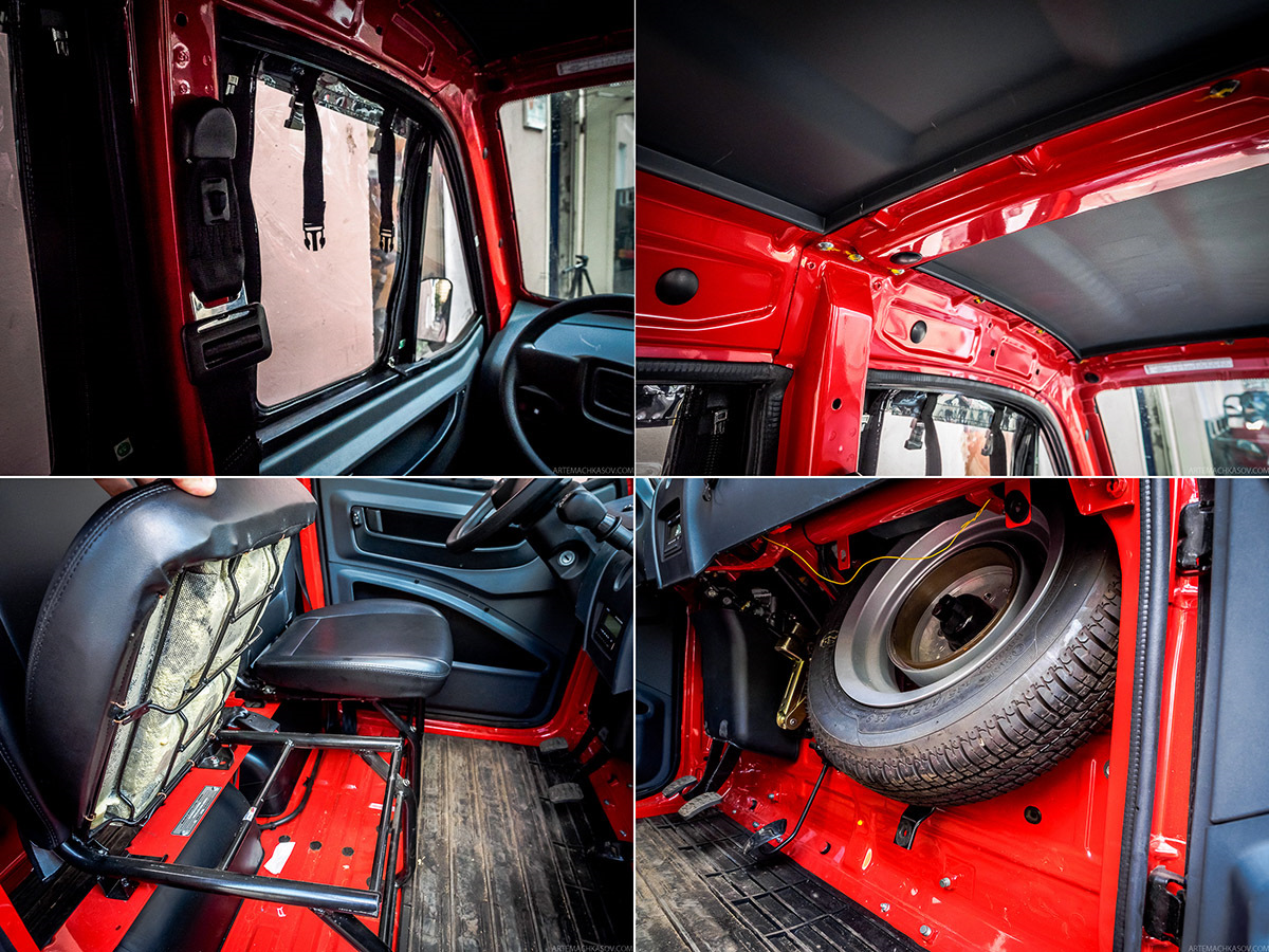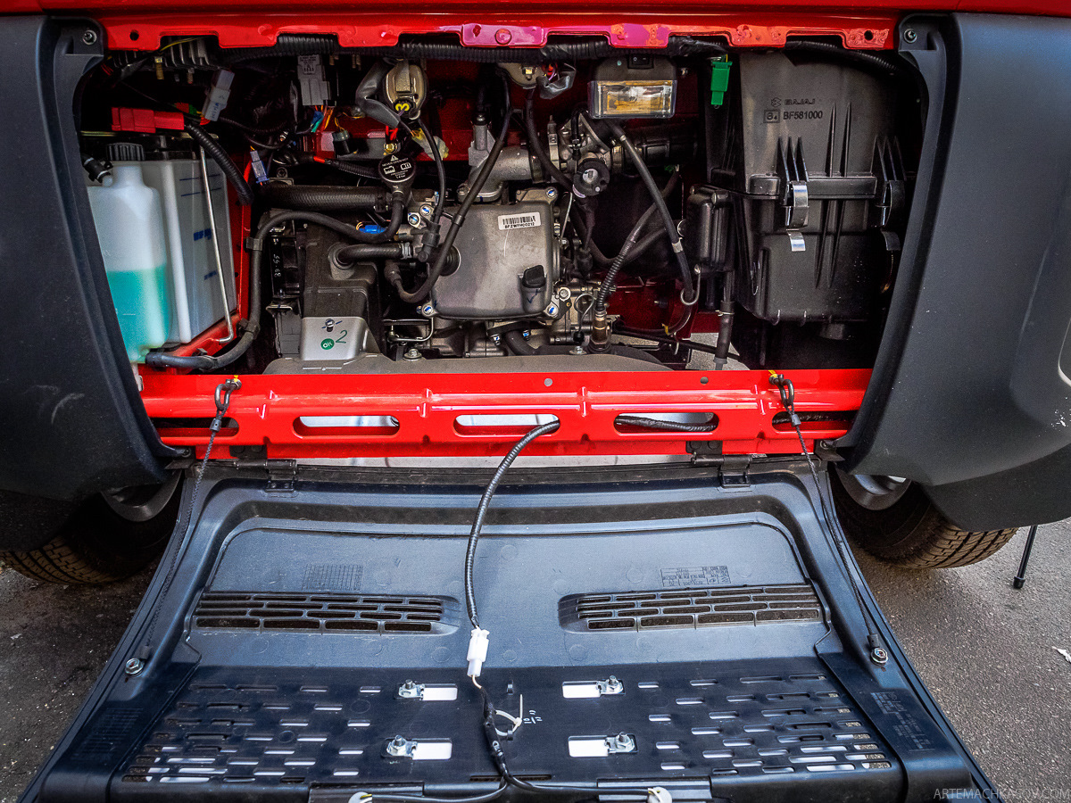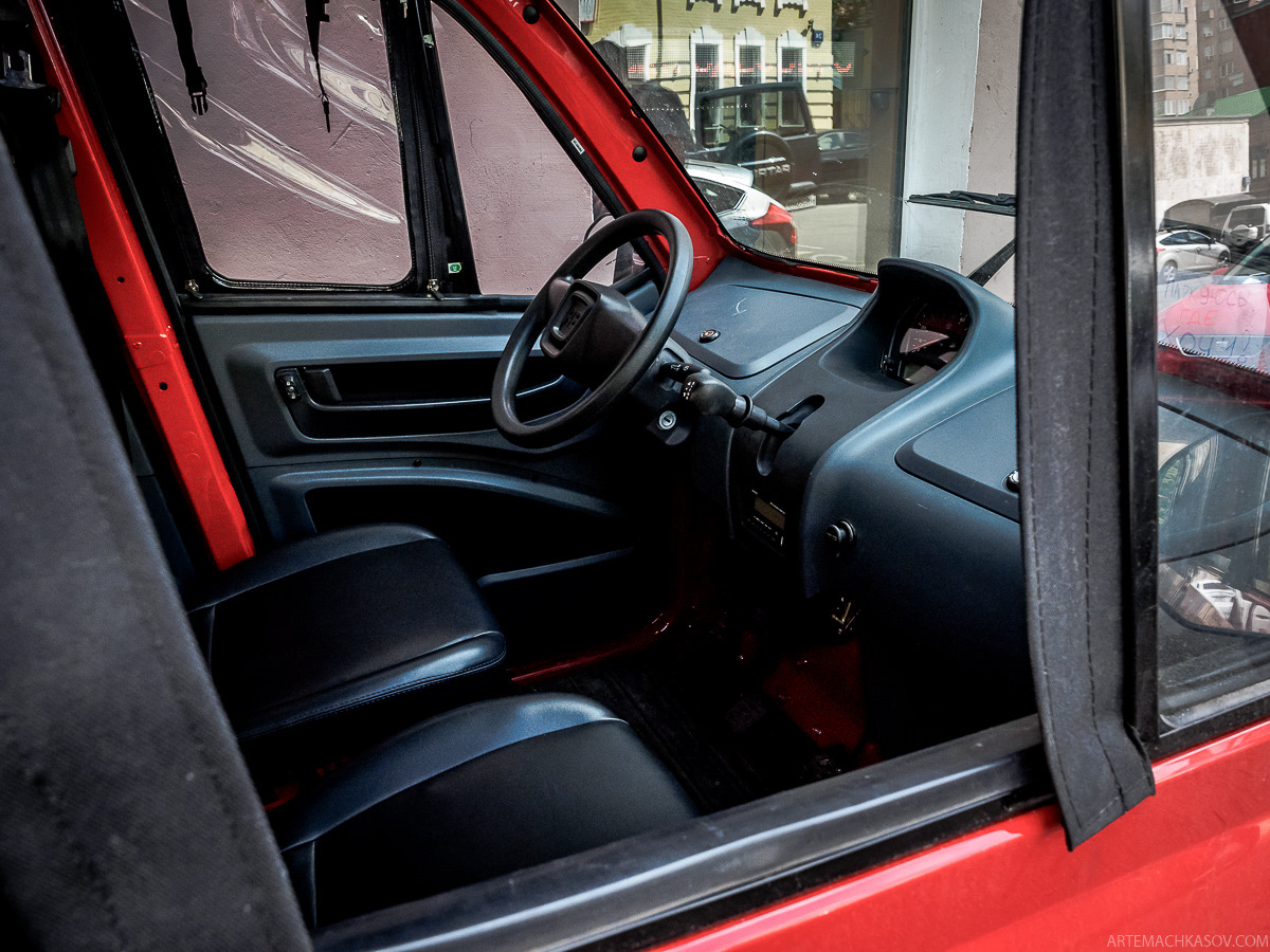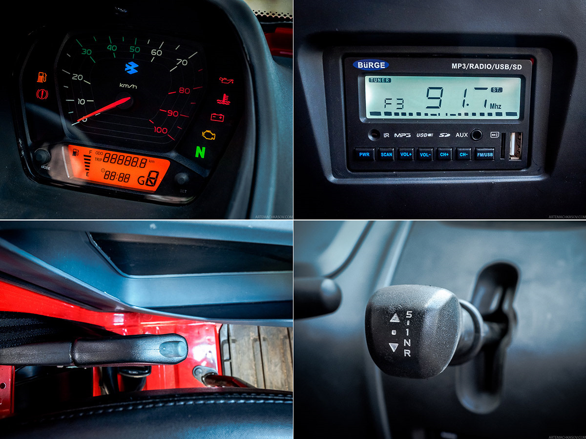 Нет ни кондея, ни даже системы принудительной вентиляции. Говорят, что стекла в двери и отопитель будут доступны у нас в качестве опции. Разумно, ведь без них покупка такого авто для круглогодичной эксплуатации не имеет никакого смысла (об этом же твердит и днище без намеков на антикор). Но на данный момент из удобств — только 12-ти вольтовая розетка и мотоциклетная радиола с USB разъемом, крошечными кнопками и ужасным звучанием.