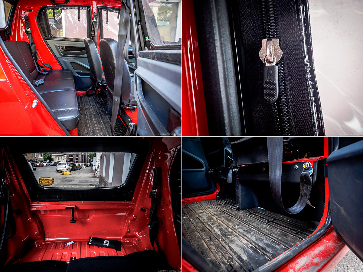 А вокруг — царство голого металла… Никакой отделки в салоне нет. Из металла сделан только силовой каркас кузова и боковые стойки, панели крыши — пластиковые (при желании, их можно снять). Возможно, что металлические усилители есть внутри передних дверей — на это намекают металлические штыри на стойках и ответные крепежи на дверях.