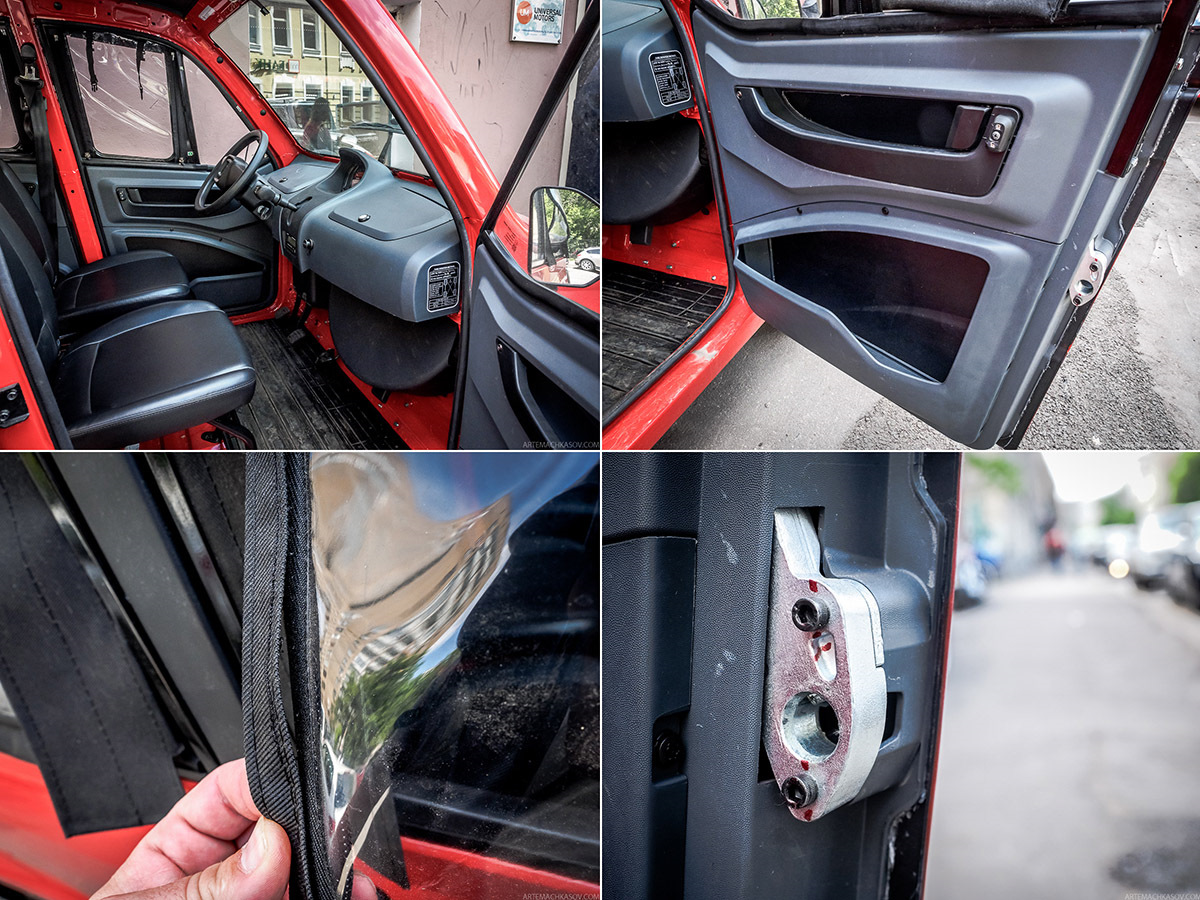 Qute начинает удивлять снаружи, и продолжает делать это внутри. Невесомые двери лишены привычных замков — закрыть их можно только примитивными задвижками изнутри. Стекол тоже нет — вместо них виниловые пленки, которые можно скрутить в трубочку и закрепить при помощи карабина в открытом положении.