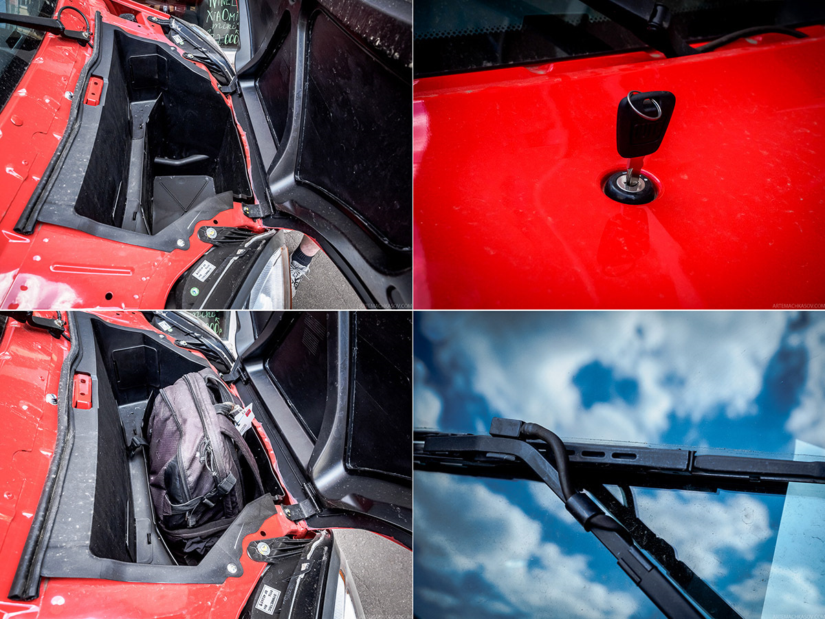 Двери багажника у автомобиля нет, точнее, есть, но не в привычном месте, а спереди, как у Tesla. В отделанный пластиком короб помещается большой фоторюкзак. Под стеклом — горловина бачка омывателя, пластиковая крышка капота — на замке.