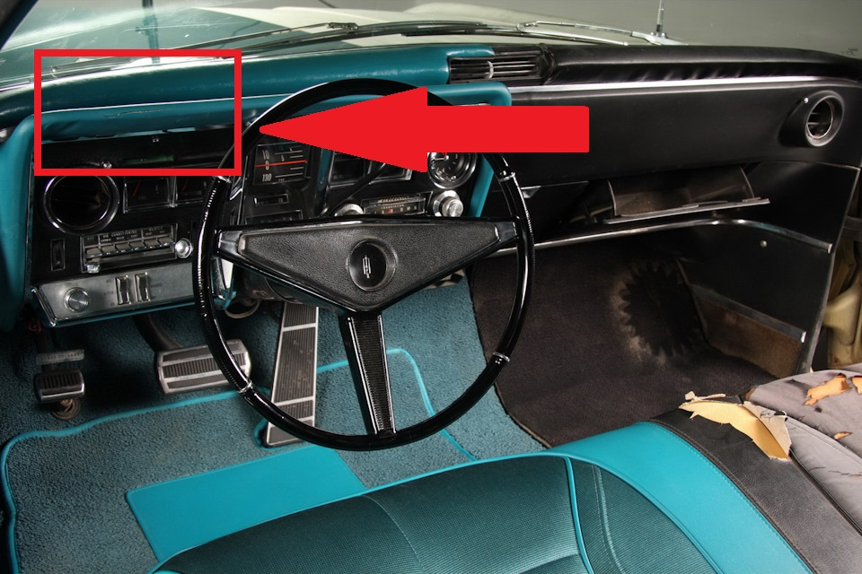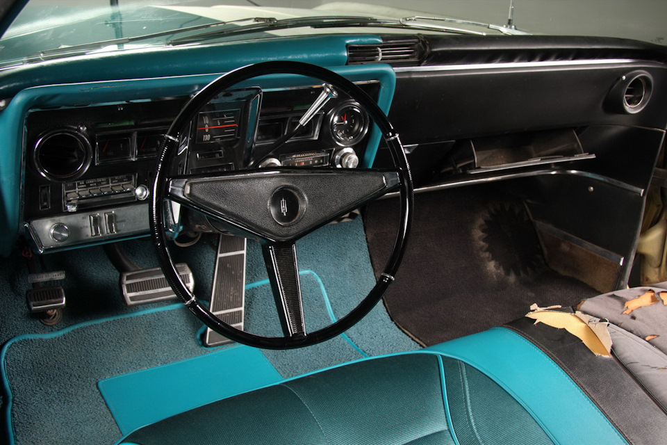 Водительская сторона автомобиля была полностью восстановлена до безупречного музейного состояния. Эту половинку машины окрасили красивейшим бирюзовым металликом Tahoe Turquoise, полностью обновили весь декоративный хром на бамперах и облицовке, перешили салон, используя аутентичные материалы, аналогичные заводским.