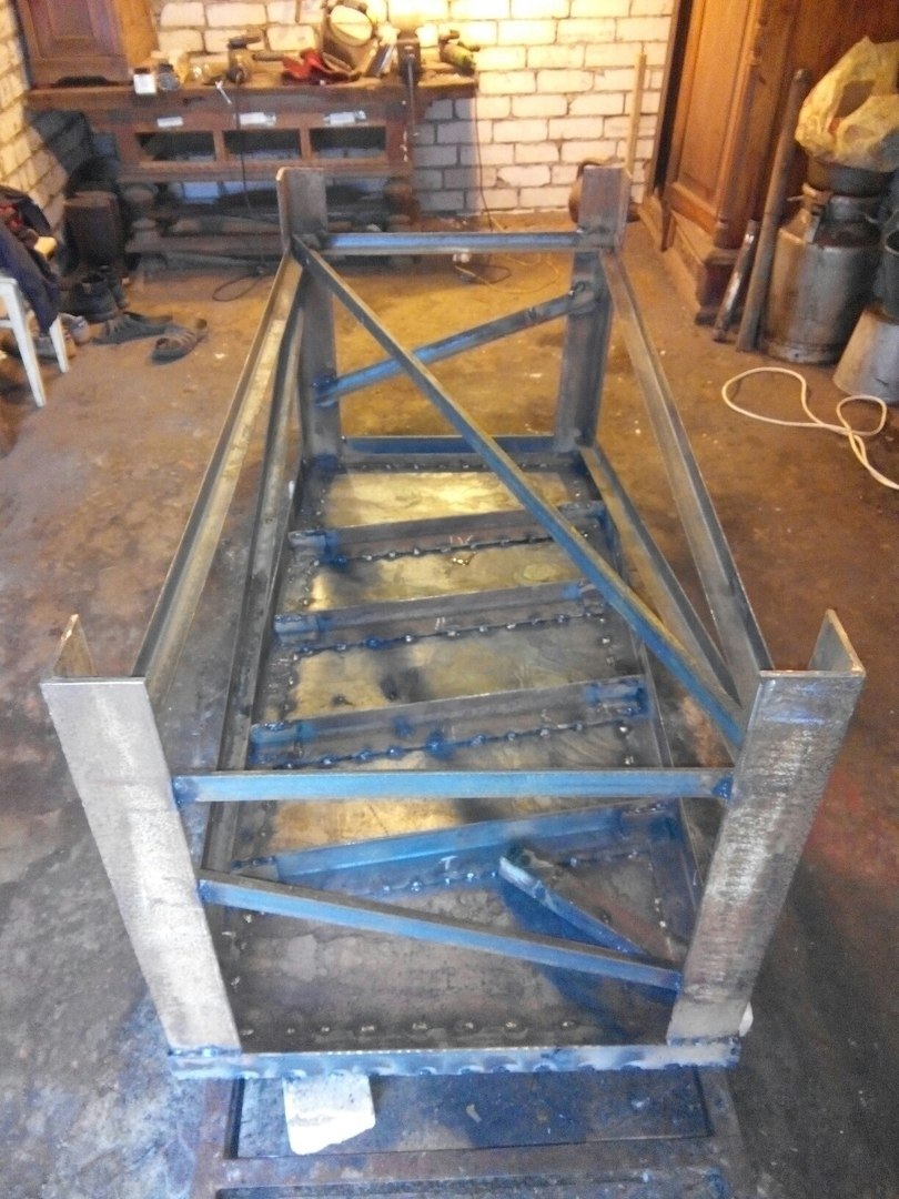На крышку был использован лист ГК толщиной 3 мм, для ножек — уголок 100*100мм, для каркаса столешницы — уголок 63 мм, для укосин — уголок 40 мм, для площадок под ноги — стенка уголка 150*150 мм толщиной 12 мм.
