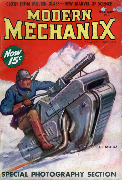 Казалось бы, легкая броня и высокая проходимость должны были сделать эту модель идеальным военным мотоциклом, что и изобразил художник журнала Modern Mechanix.
