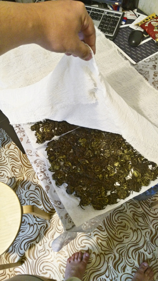 На самом деле процесс ферментации ещё не окончен, он медленно будет затихать в течении даже месяцев! Но не на ткани конечно))) Когда уже готовый чай отлежался часа 3, я его пересыпаю в банки, закрываю и оставляю на пару месяцев точно.