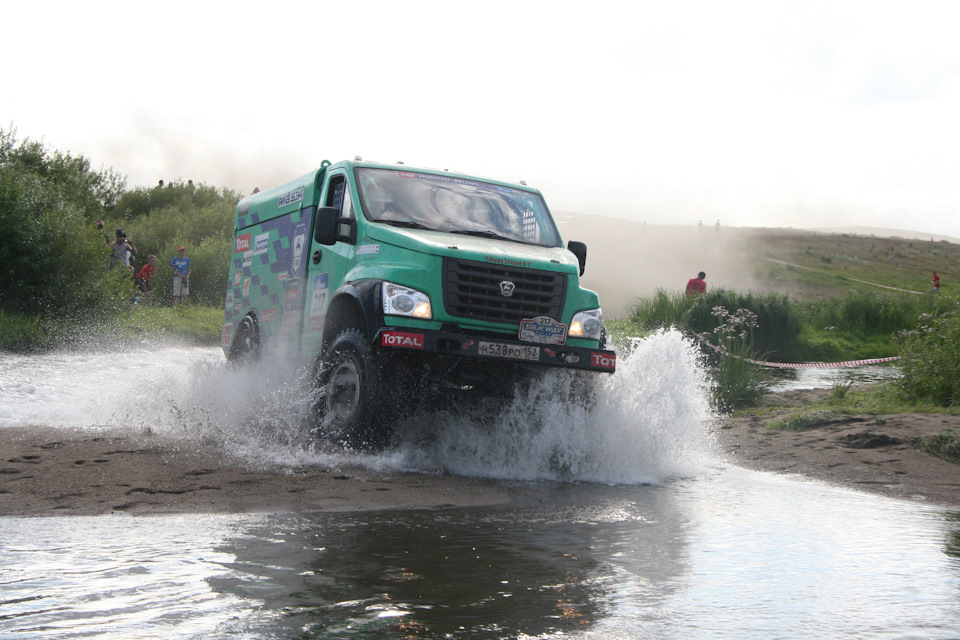 Для «газовских» машин день сложился очень хорошо: все доехали без приключений типа проколов и поломок и в своем ритме. Правда, на ГАЗели NEXT T1 Саши Кострукова тоже оборвало переднюю полуось, но это ему не помешало легко форсировать брод даже в режиме 4х2. А Слава Субботин на другой белой ГАЗели NEXT останавливался, чтобы вытащить из канавы застрявшую буржуинскую багги. Лучшим по дню из наших оказался Миша Коструков на зеленой ГАЗели NEXT: он стал 49-м. Девчонки на Соболе тоже молодцы: после известного инцидента на прологе они занимали последнее место, а тут отыграли сразу больше десятка позиций.