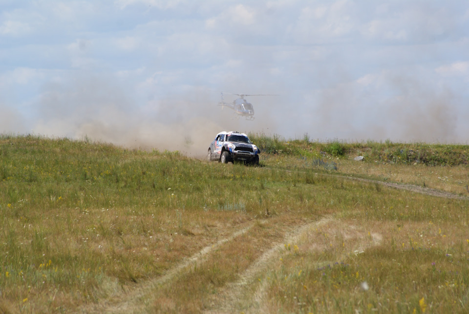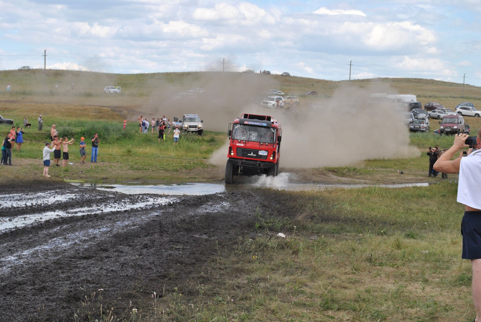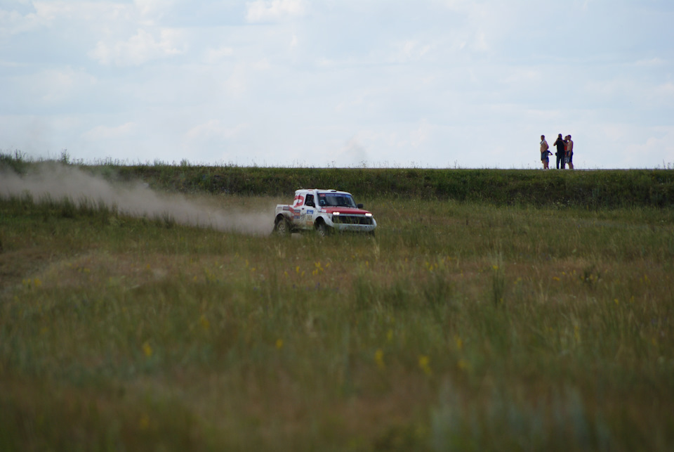 Всем привет! Накануне у нас не работал Интернет, поэтому сейчас кидаю коротенький отчет сразу за два последних дня. Вчера мы переезжали из Уфы в казахский город Кустанай – это был длинный 800-километровый перегон, в ходе которого в Челябинской области мы маленько цепляли и Уральские горы. Там же, в Челябинской области, был проложен и спецучасток для гоночных автомобилей. Мы поехали встречать караван почти на финиш – там как раз гоночная трасса пересекала вброд небольшую речушку с колоритным названием Уй. Нас особо развеселило это название еще и по той причине, что незадолго до этого мы притормаживали напротив АЗС, которая называлась Ук Ойл и усиленно косила под Лукойл. Вот и получилось, что поехали мы с Ук точнёхонько на Уй )) Как мы уже знаем, броды – это именно те места, где могут происходить самые веселые моменты гонки и где расстановка сил может меняться достаточно неожиданно. Собственно, ровно так же подумали 90% других фотографов и видеооператоров, сопровождающих гонку, поэтому практически все мы вот там и встретились, облепив всю береговую линию. Глубина брода была по колено, дно – песчано-каменистое, так что в принципе для полноприводной техники это не было сколько-либо серьезным препятствием. Но ведь в составе каравана идет много заднеприводных багги – вот на них-то мы и возлагали особые «надежды» — что кто-то стушуется и встанет в броде на потеху публике ))