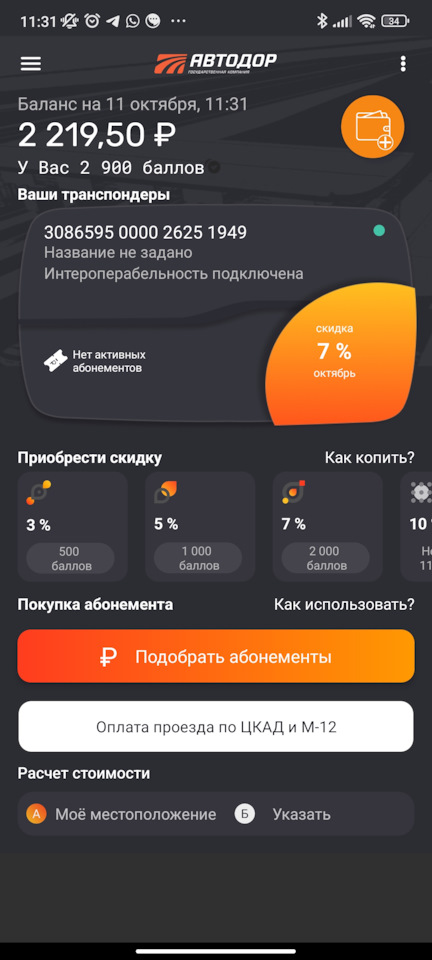 У меня немного другая ситуация — я постоянно мотаюсь по ещё одному платнику автодоровскому, и транспондер — штука очень выручающая. А экономить можно, покупая за баллы скидку на проезд в приложении.