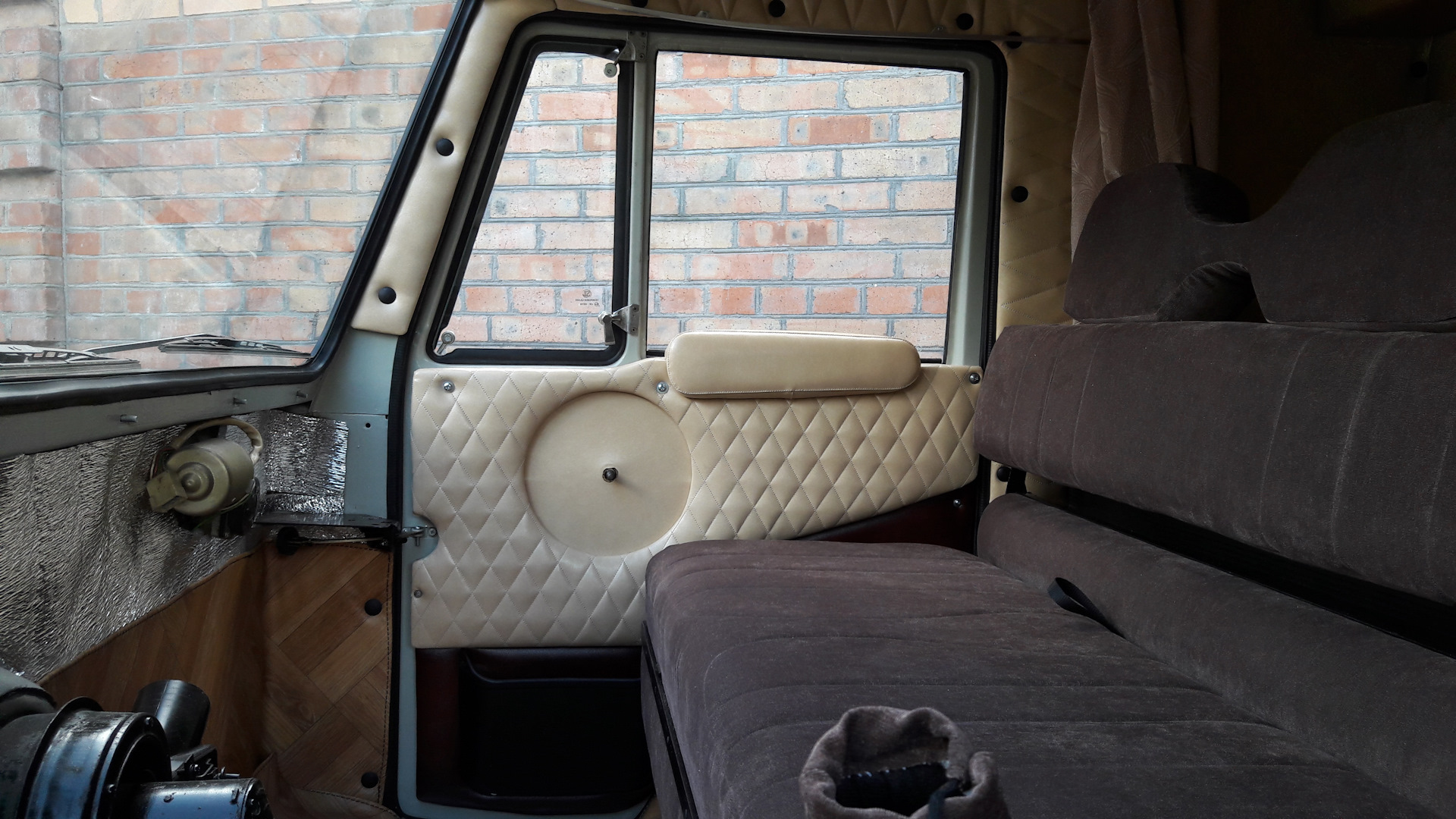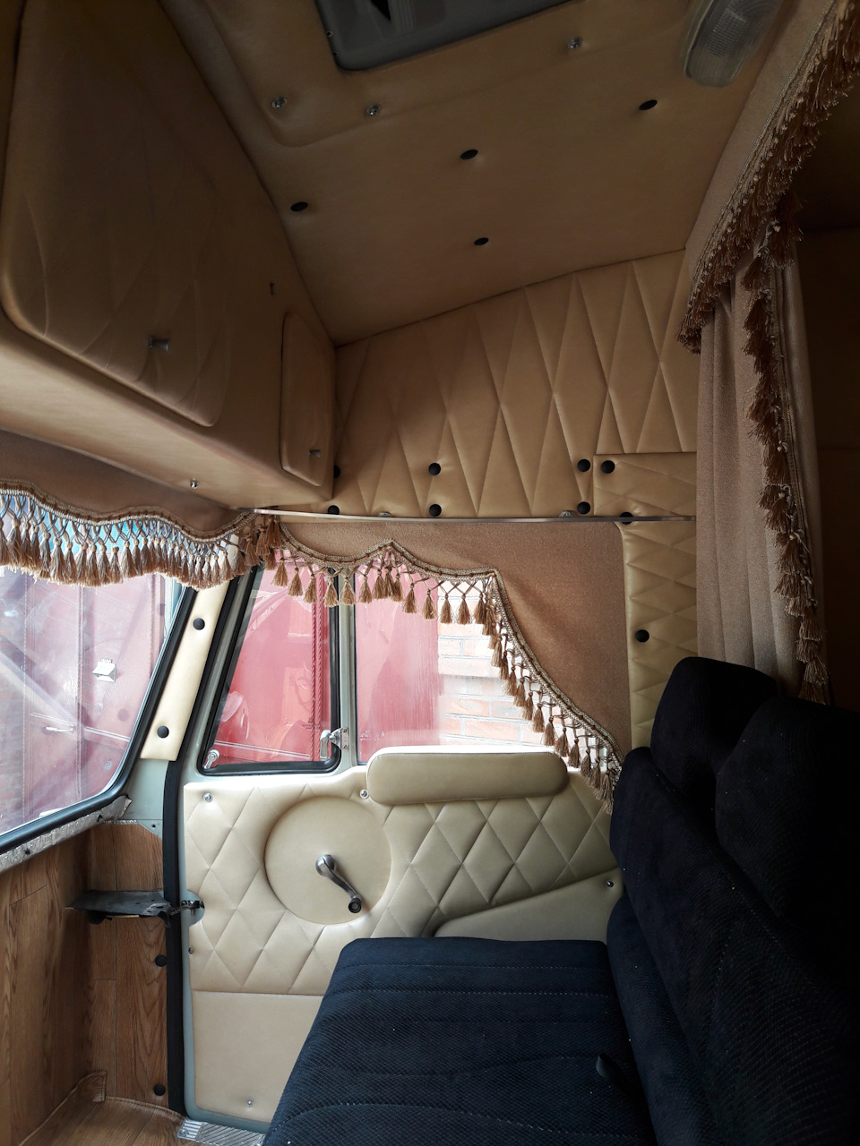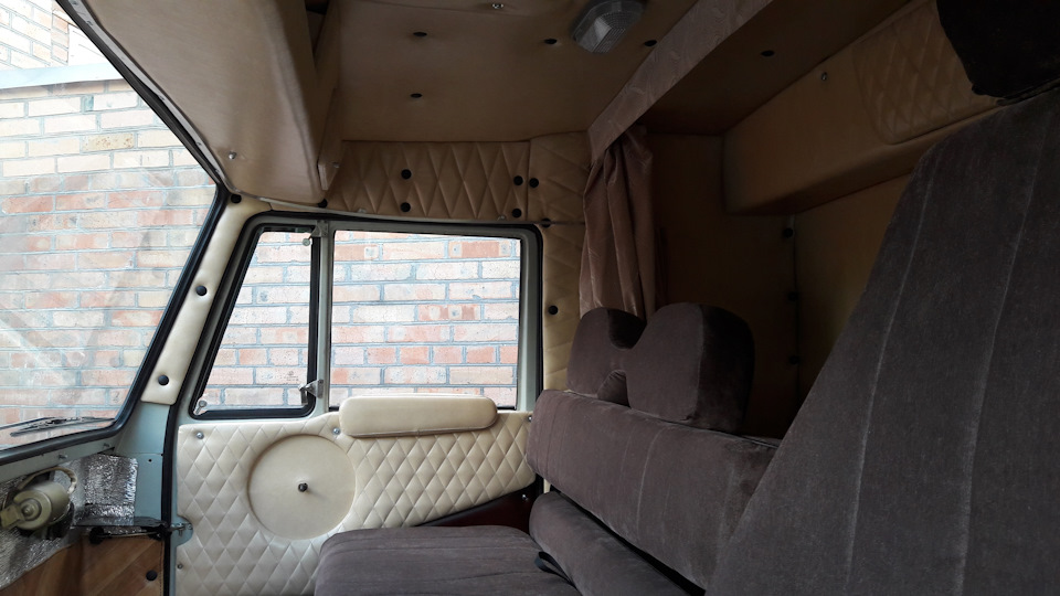 Сделали две откидные спалки (поварили всю металоконструкцию с нулю, сделал удобные упоры-фиксаторы), установили под нижнюю биотуалет и бак для воды, установили багеты для штор, сделали подушки для большого спального места (два дивана).