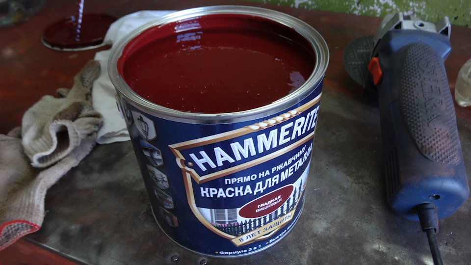 Небольшой опыт с чёрной краской Хаммерайт уже был. Хотелось продолжить эксперимент, но более масштабно и приобрёл теперь вишнёвую гладкую краску (2,5 литра мне хватило на всё, но без запаса).
