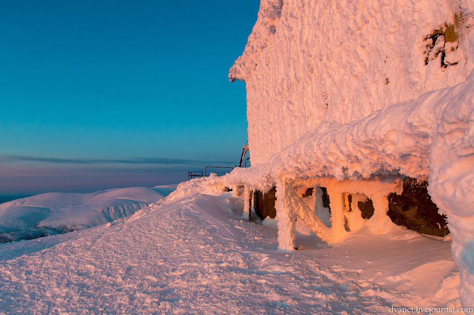 14. Если внизу есть небольшой ветерок, то в связи с особенностями рельефа на вершине конкретно так дует. Пока поднимаешься, успеваешь подмерзнуть. Но холод и ветер, это, на самом деле, очень неплохо, потому что все нежные товарищи убегают прятаться в кафе и на склонах практически никого нет. Лишь бы не закрыли подъемники:
