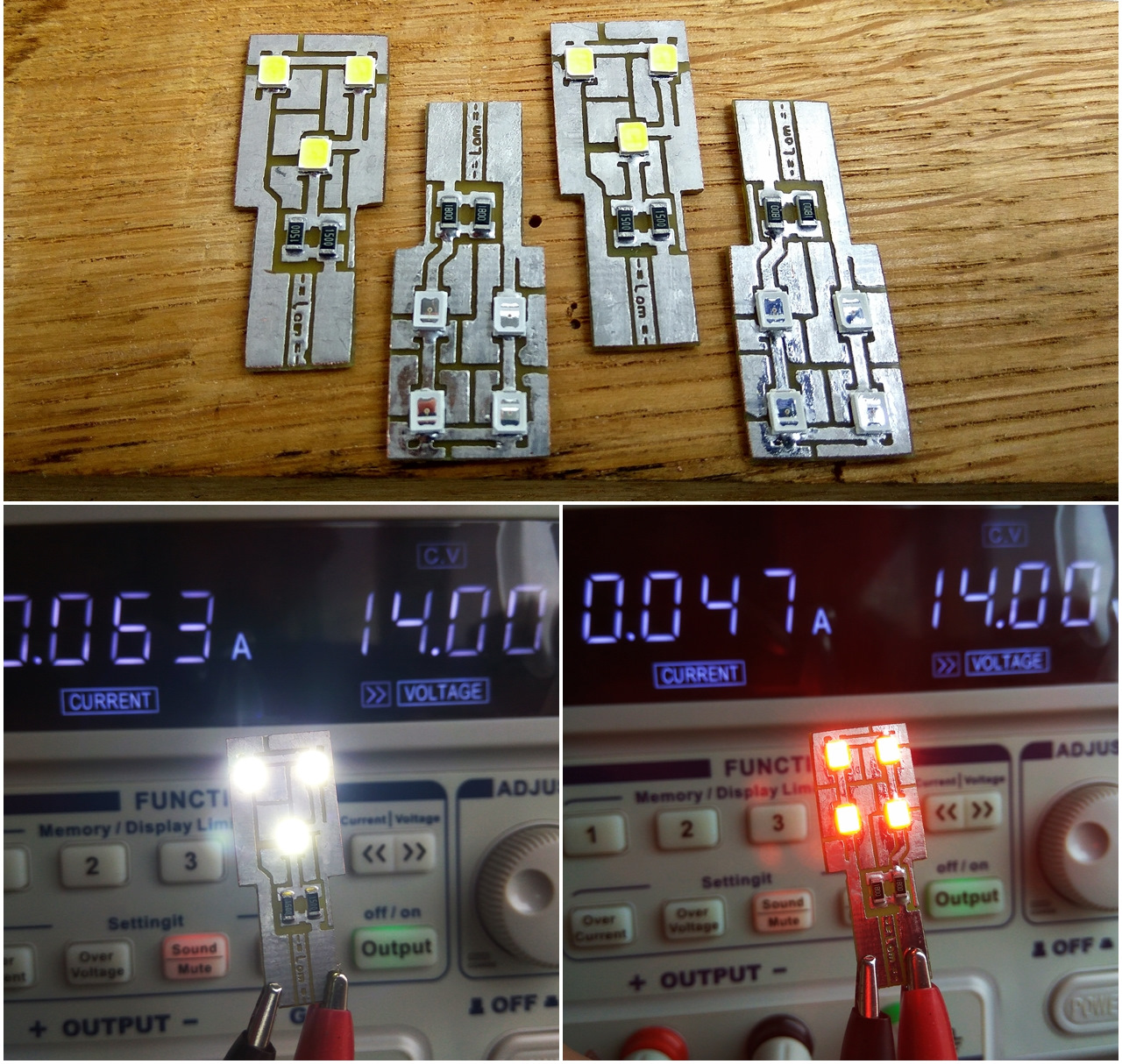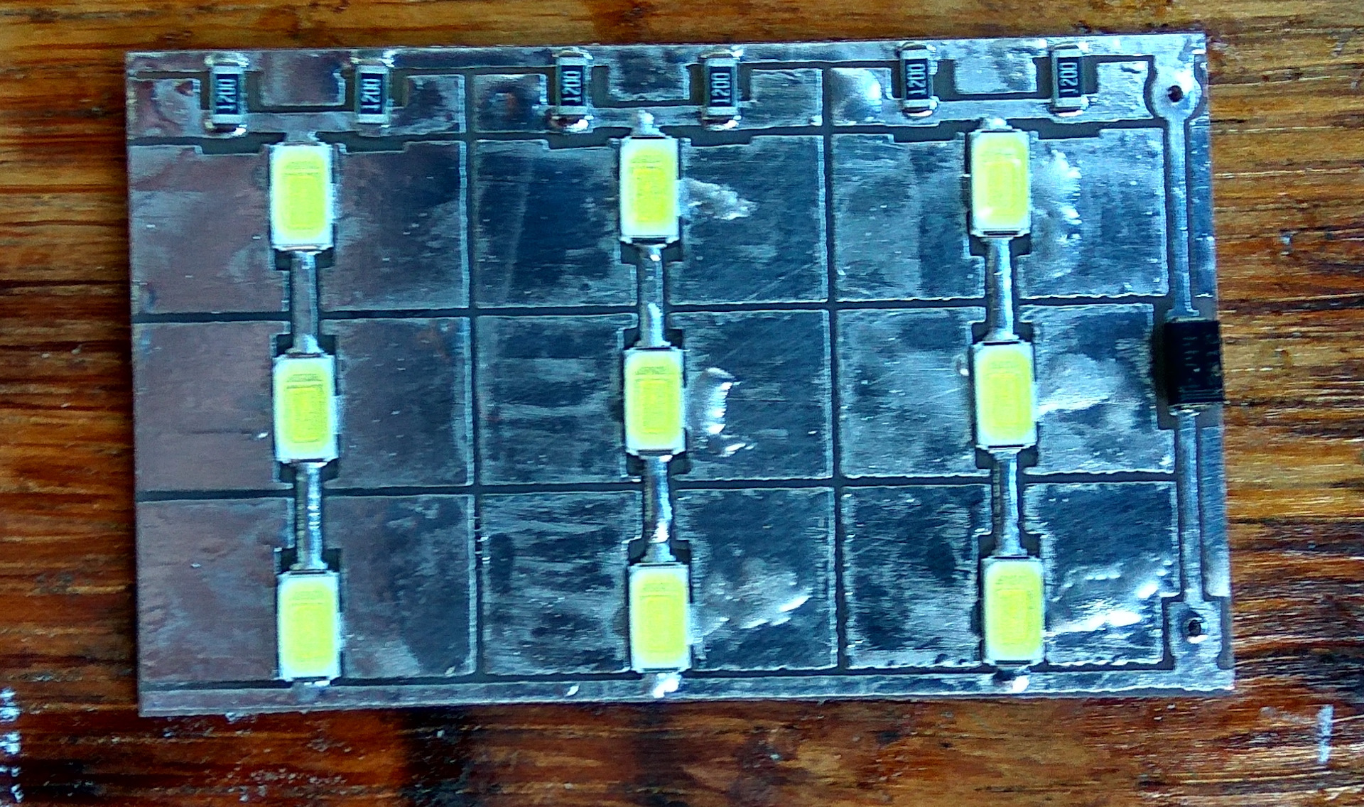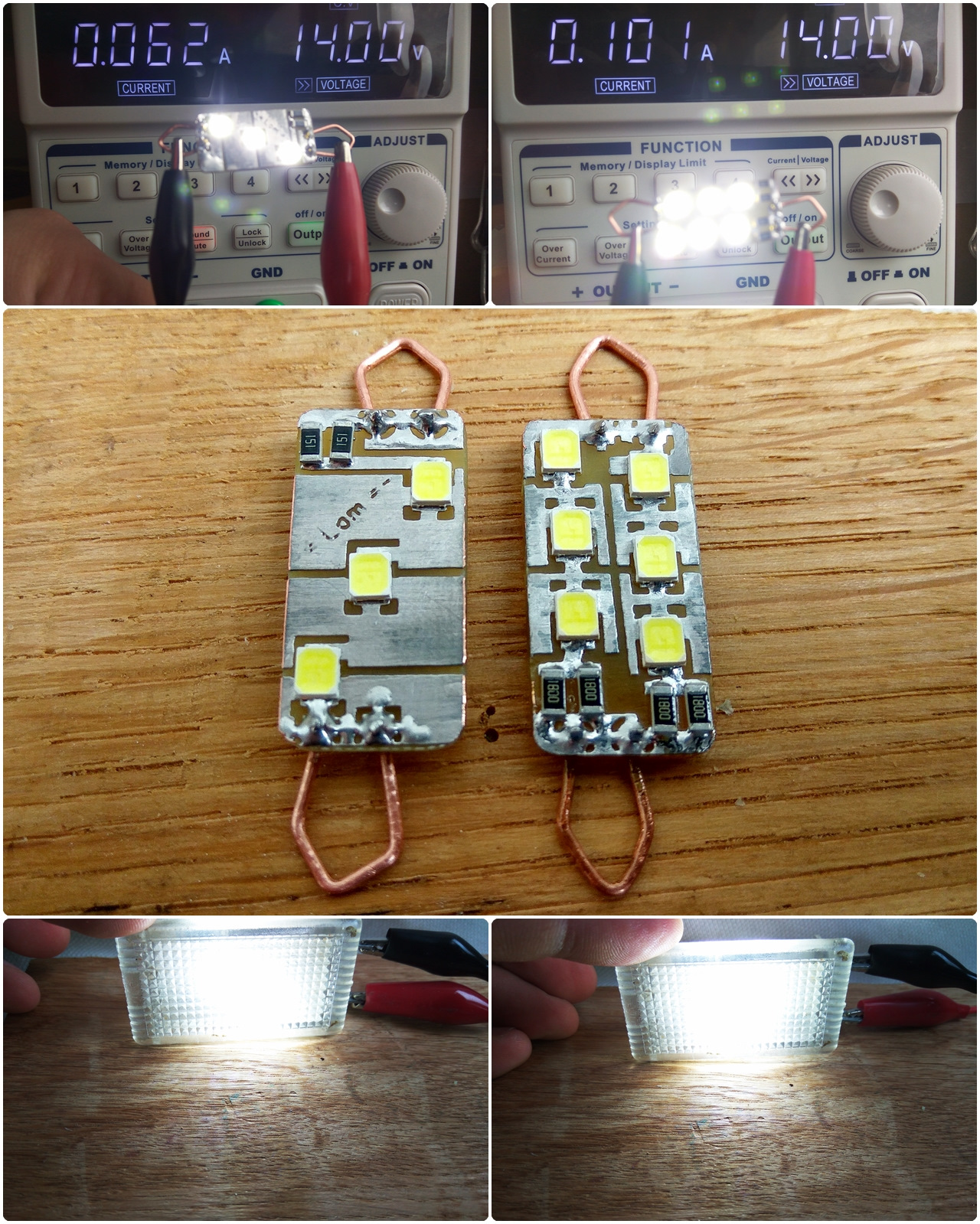 Модули в плафон подсветки ног и багажника А6С4. Два варианта. Больше диодов = больше яркости, но условия теплоотвода хуже.