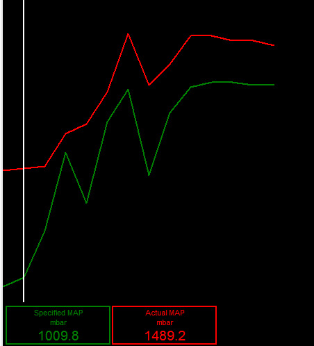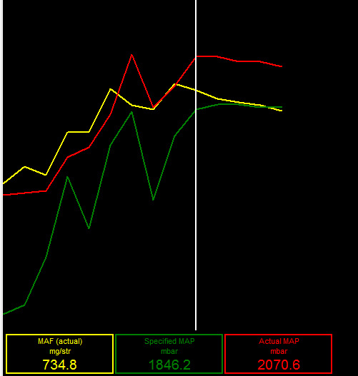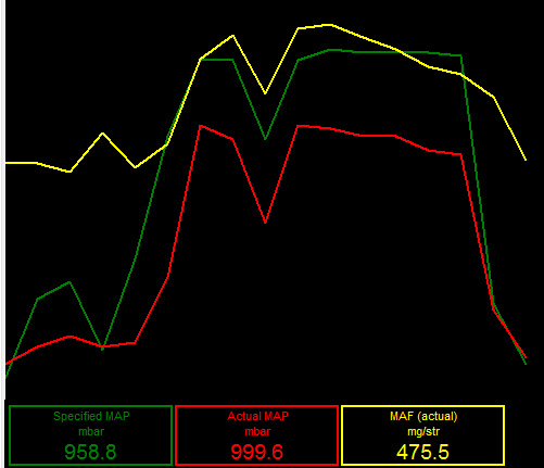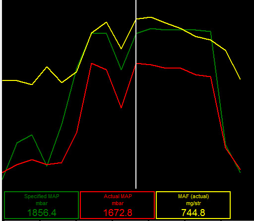 3-я передача, реальное давление на 190 мбар ниже запрашиваемого. Вот так проявляется утечка во впуске при исправном датчике.