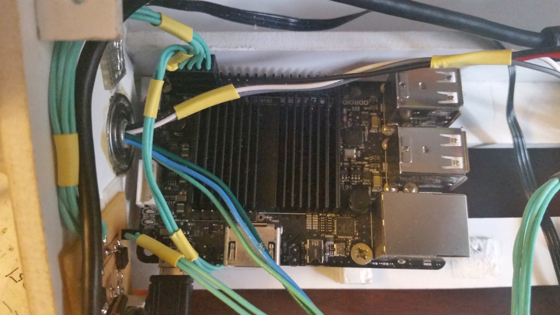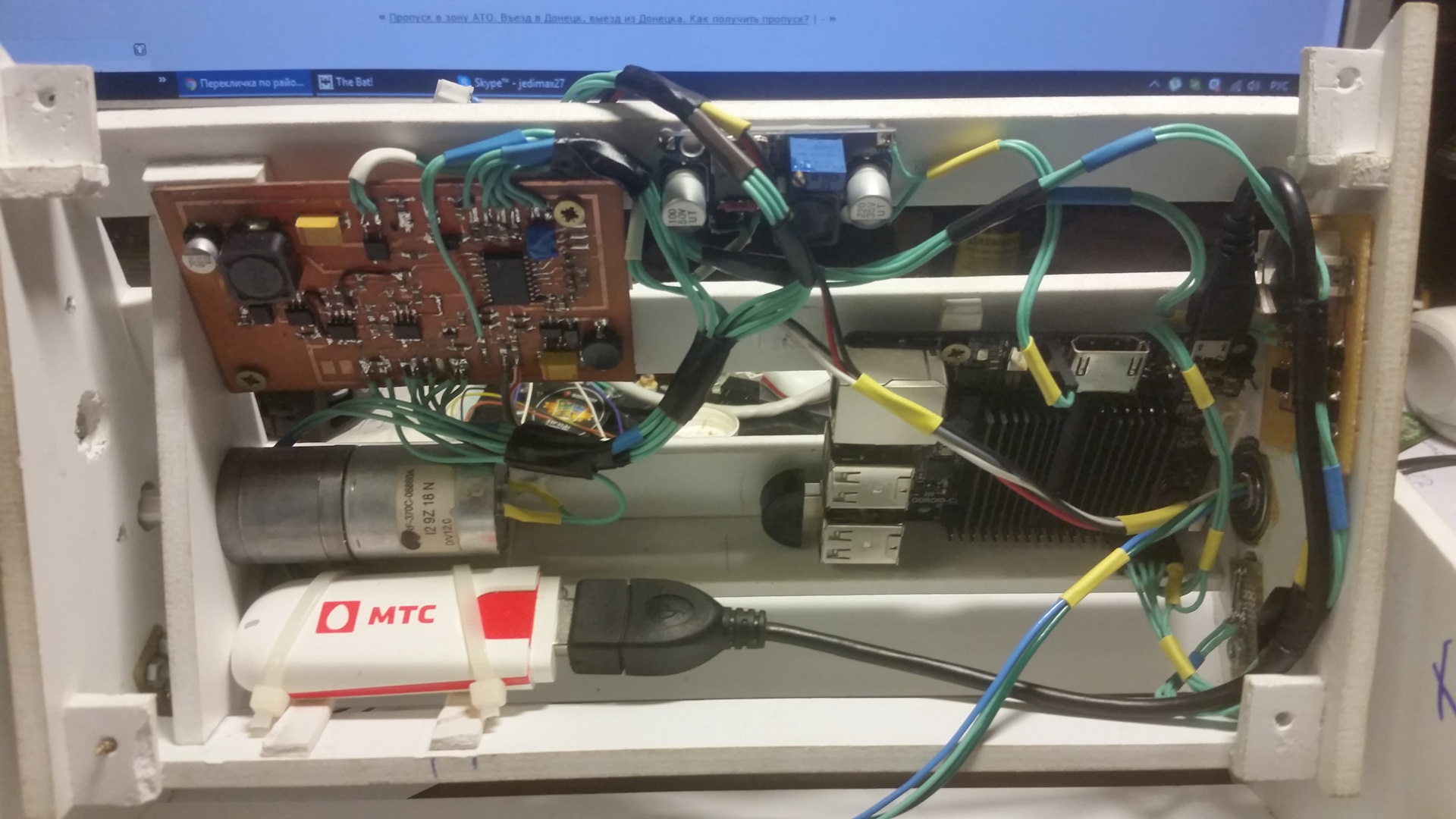 Для питания устройств нужно 5 вольт. Вначале я думал питать плату контроллера и микрокомпьютер от одного стабилизатора (он виден в правом нижнем углу платы контроллера). Но, как оказалось (моя вина — не правильно рассчитал) его мощности не хватает. С другой стороны — это хорошо. Ибо, во-первых, стабилизатор на плтате получился с запасом по мощности (так, раз в пять), а, во-вторых, питать мощный потребитель (Одроид с периферией может потреблять до 2А) от отдельного источника питание — это весьма гуд.