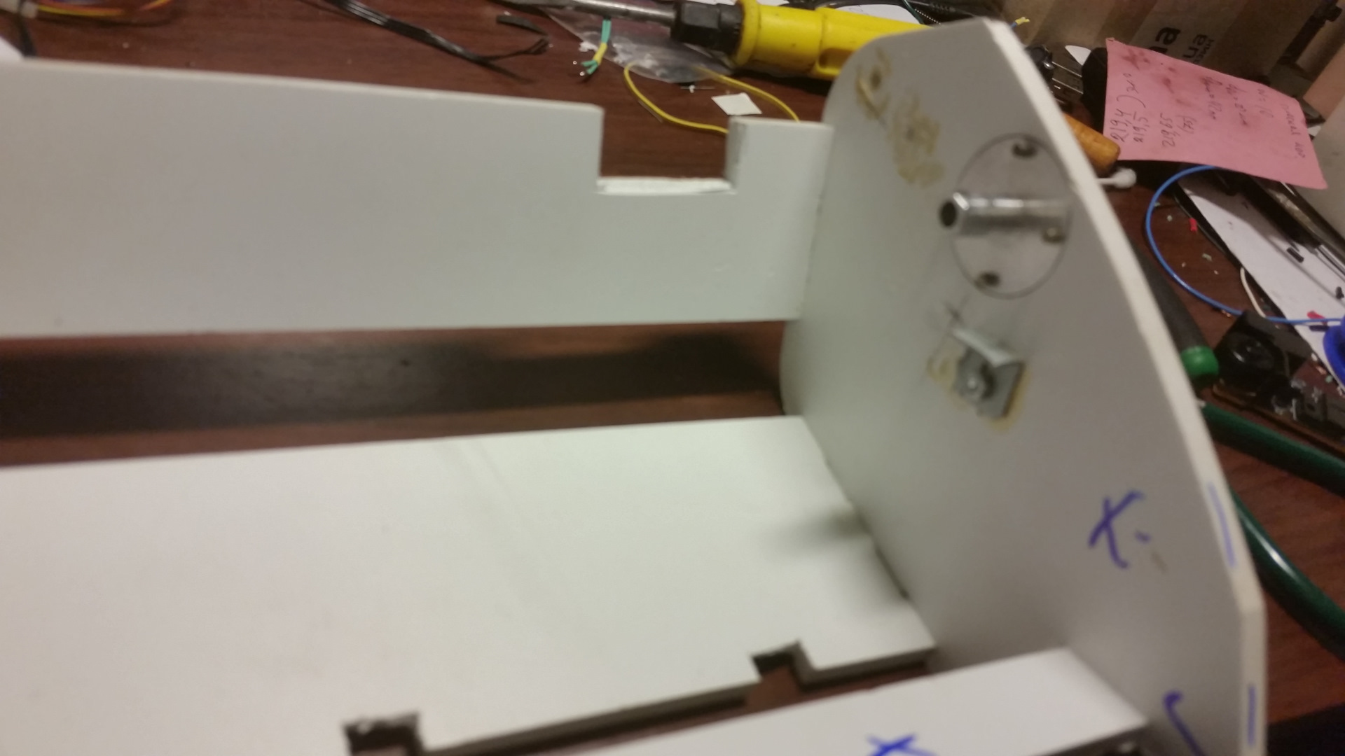 Когда собрал, увидел, что белый пластик некрасиво смотрится (с чего б это?). Пришлось разобрать и оклеить всё, что видно, чёрной пленкой (на первом и втором фото видно обозначение поверхностей, которые нужно обклеить). Кстати, та плёнка, что я купил (автомобильная), клеилась к пластику так себе. В принципе, это хорошо — можно исправить не боясь растянуть (с рекламным Oracal'ом так не получится — он клеится сразу практически насмерть). После приклейки надо нагреть феном и будет всё более-менее нормально. И растягивается автомобильная плёнка лучше.