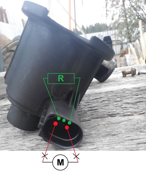 Цитирую:Я же нашел оптимальный вариант: разбираем клапан ЕГР и контакты, которые идут на электродвигатель разгибаем отверткой. Потом поворачиваем электродвигатель в верхнее положение, чтобы клапан закрылся полностью. Собираем и прозваниваем между собой два нижних контакта (красные на схеме), если сопротивление равно бесконечности, то всё хорошо. Теперь прозванием по очереди эти контакты (красные на схеме) на замыкание с корпусом, если сопротивление равно бесконечности, то всё хорошо. Собираем клапан, чистим его посадочное место и устанавливаем его обратно. Подключаем фишку! Сопротивление крайних "зеленых" контактов на схеме дает компьютеру понять что клапан ЕГР подключен.