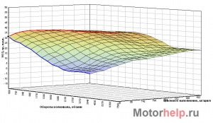 С появлением микропроцессорных систем управления двигателем появилась возможность более точно настраивать УОЗ для различных режимов работы двигателя. Если в трамблерах за изменение УОЗ отвечал вакуумный и центробежный регулятор, то умная электроника на основании данных с датчиков системы управления двигателем сама высчитает необходимый оптимальный угол согласно картам калибровок, заложенных в прошивке контроллера. Вот типичный пример трехмерной карты калибровок УОЗ для одного режима работы двигателя (ВАЗ, блок М73).