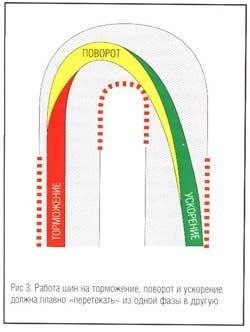 Если пойти дальше, то как только вершина поворота пройдена (а в ней 100 процентов сцепления шин использовалось на поворот), соотношение вновь должно меняться. Работа шин на поворот должна постепенно уступать место работе на ускорение. Таким образом, в повороте потенциал сцепления шины постоянно делится: сначала между торможением и поворотом, затем между поворотом и ускорением, причем с наложением этих фаз друг на друга (рис. 1). Чтобы не забывать об этой виртуальной связи между разгоном, торможением и рулением в повороте, представьте себе, что педали тормоза и газа механически связаны с рулем. Чем больше повернут руль, тем меньше давление на педаль тормоза или газа. Чем больше нажаты педали, тем меньше повернут руль. Нарушение этого баланса заставляет шины выполнять больше работы, чем им по силам, и они теряют сцепление!