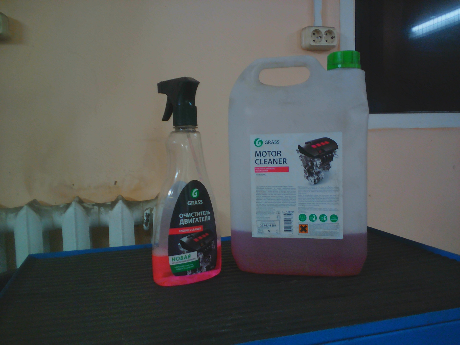 Первым пойдет быстрый очиститель, именно так написано на этикетке. Причем канистра с этим добром была куплена вообще по ошибке. Изначально я надеялся, что там будет пенный очиститель двигателя и всего остального. Налито там что то наподобие уайт-спирита или нефраса, только запах не такой противный. Высыхает быстро, оставляя сухую обезжиренную поверхность. Идеально подходит для очистки деталей перед финальной сборкой. В баллончике тоже самое, только под давлением, с помощью него очень удобно смывать, например, пролитое на двигатель, во время замены, масло.Просто пшикнул — и все.