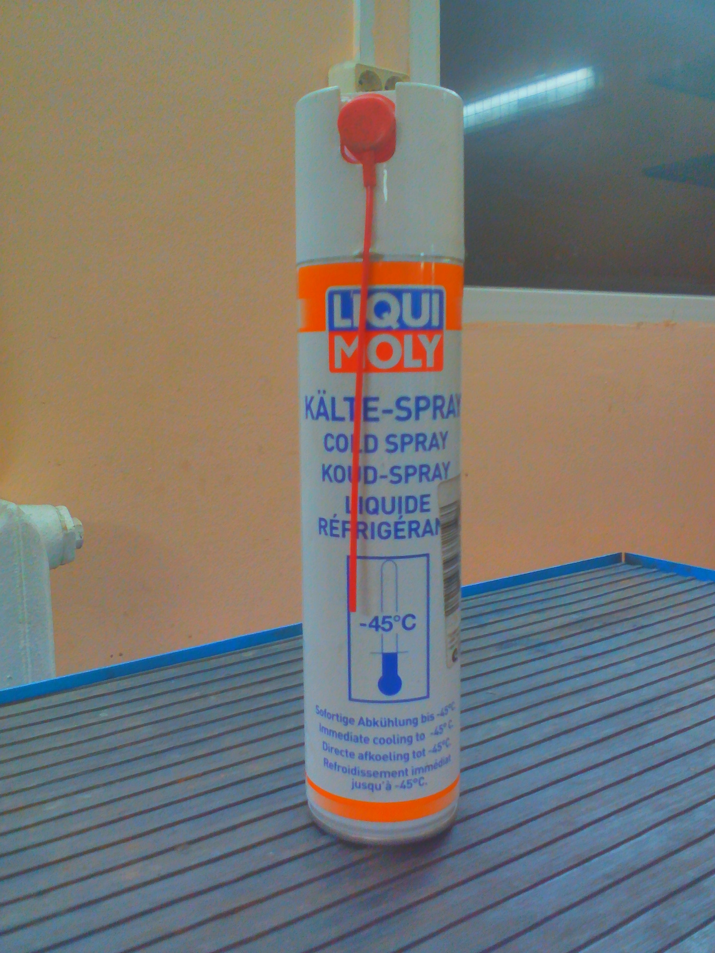 Прикольная фигня, реально замораживает. Использовал для замены направляющих втулок клапанов. Клал направляйки в коробочку, выложенную фольгопластом, а через щелку заливал охладитель. Помогает. Только есть у этого охладителя два больших минуса: цена и обьем. Стоит он около пятисот рублей, на 30 направляек у меня ушло 2 баллона. Вместо него гораздо лучше использовать сухой лед, тот же самый эффект, только раз в двадцать дешевле.