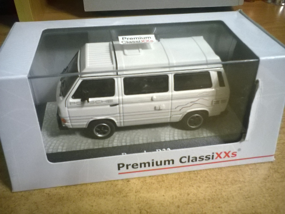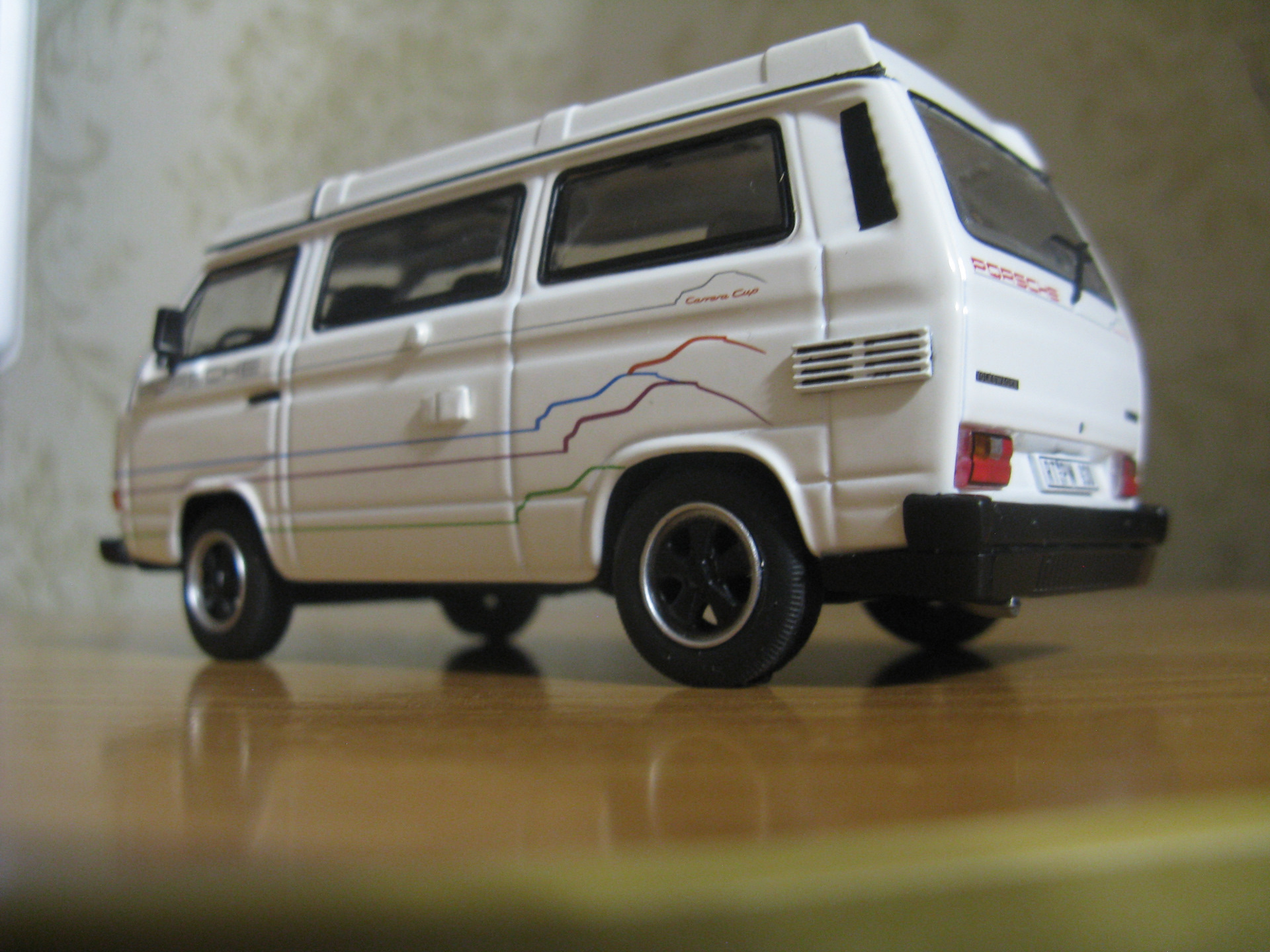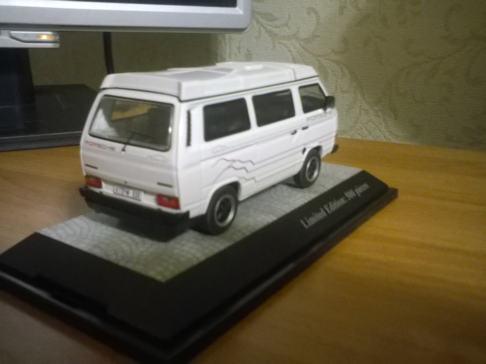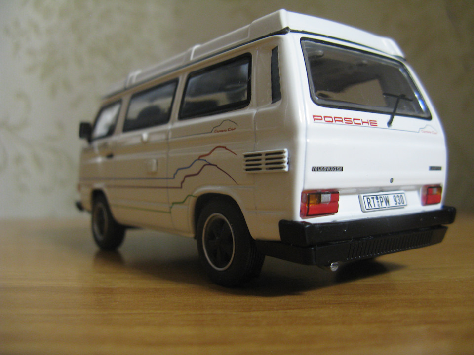 Подарил сыну на пятилетие. На сайте масштабных моделей вместе с ним выбирали VW Т3. Из довольно-таки большого выбора кузовов и расцветок, сын выбрал именно T3 Porsche B32 Camping "Carrere Cup". Масштаб 1:43.