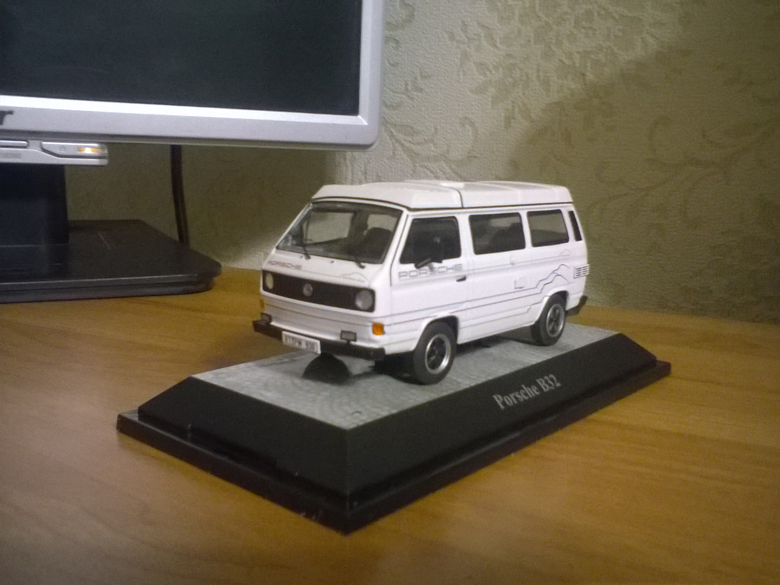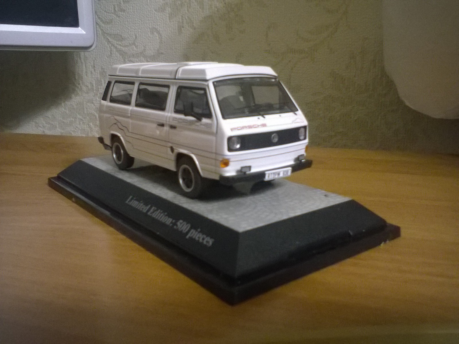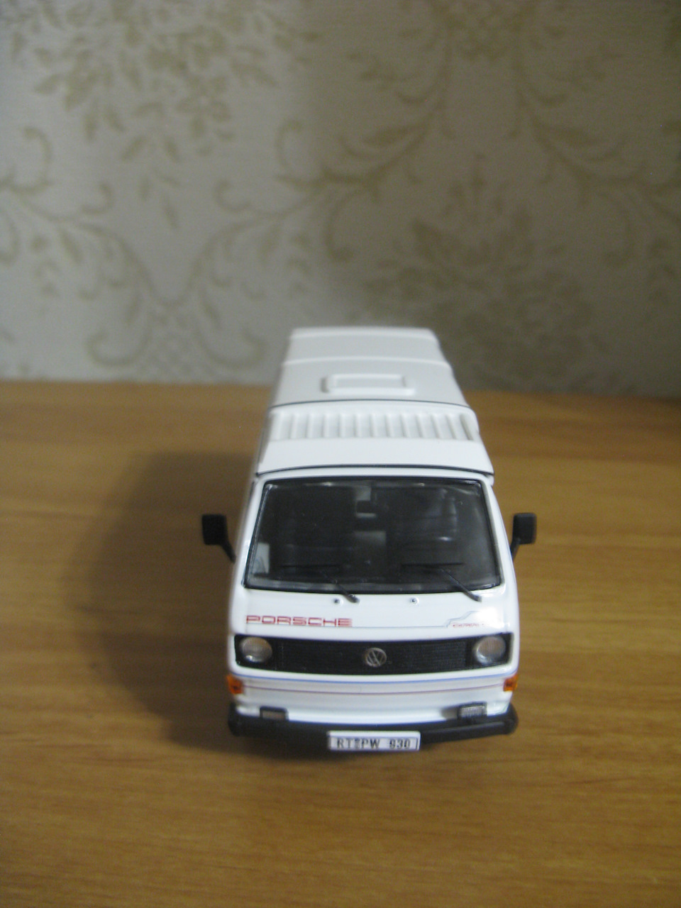 Подарил сыну на пятилетие. На сайте масштабных моделей вместе с ним выбирали VW Т3. Из довольно-таки большого выбора кузовов и расцветок, сын выбрал именно T3 Porsche B32 Camping "Carrere Cup". Масштаб 1:43.