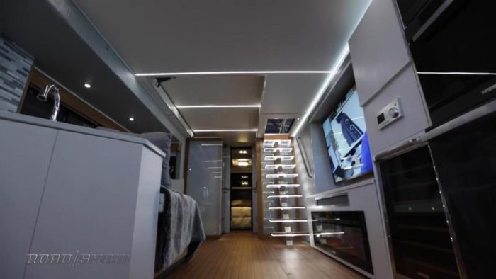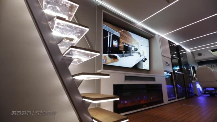 Роскошный дом на колесах Elysium от компании Furrion был представлен на выставке CES 2017 в Лас-Вегасе. Шикарный автобус оснастили по последнему слову техники, наделив его даже вертолетной площадкой и минивертолетом Robinson R22. На крыше автобуса также разместили террасу для отдыха с джакузи, а по бортам установили 75-дюймовые телевизоры с разрешением 4К. Внутри есть все, что необходимо для дальних путешествий, включая смарт- туалет и душ, кухню с индукционной плитой, посудомоечной машиной и холодильником, электрический камин, спальню и 75-дюймовый телевизор. Автобус является лишь выставочным экспонатом, который демонстрирует возможности компании Furrion, занимающейся установкой современных технических решений в домах на колесах и яхтах.