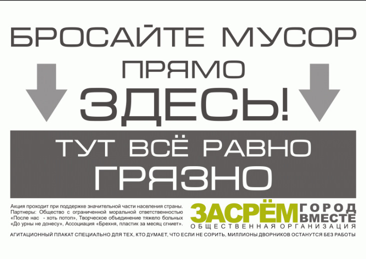 Таким образом брошенный на чистой улице окурок вполне может вылиться со временем в обоссанные лифты, сломанные телефонные будки, исписанные стены и разбитые фонари.