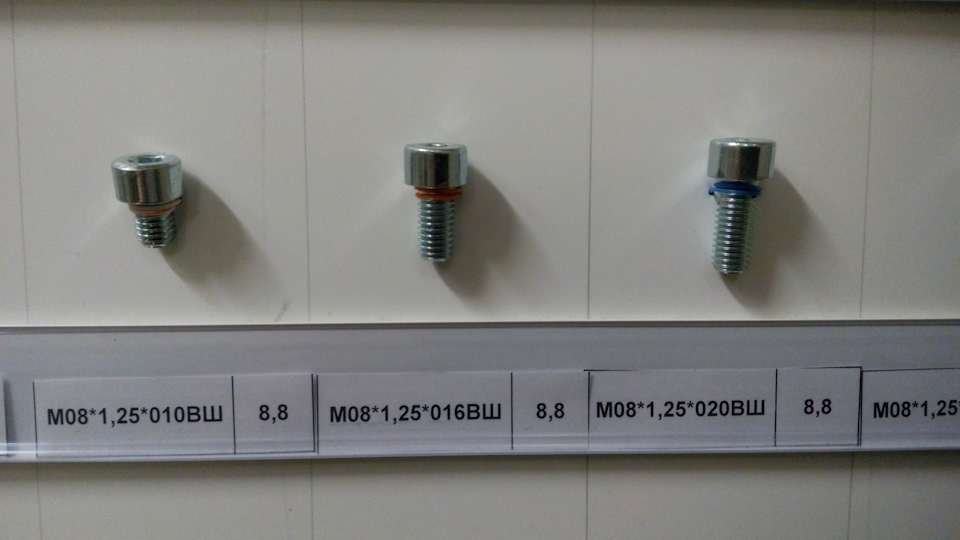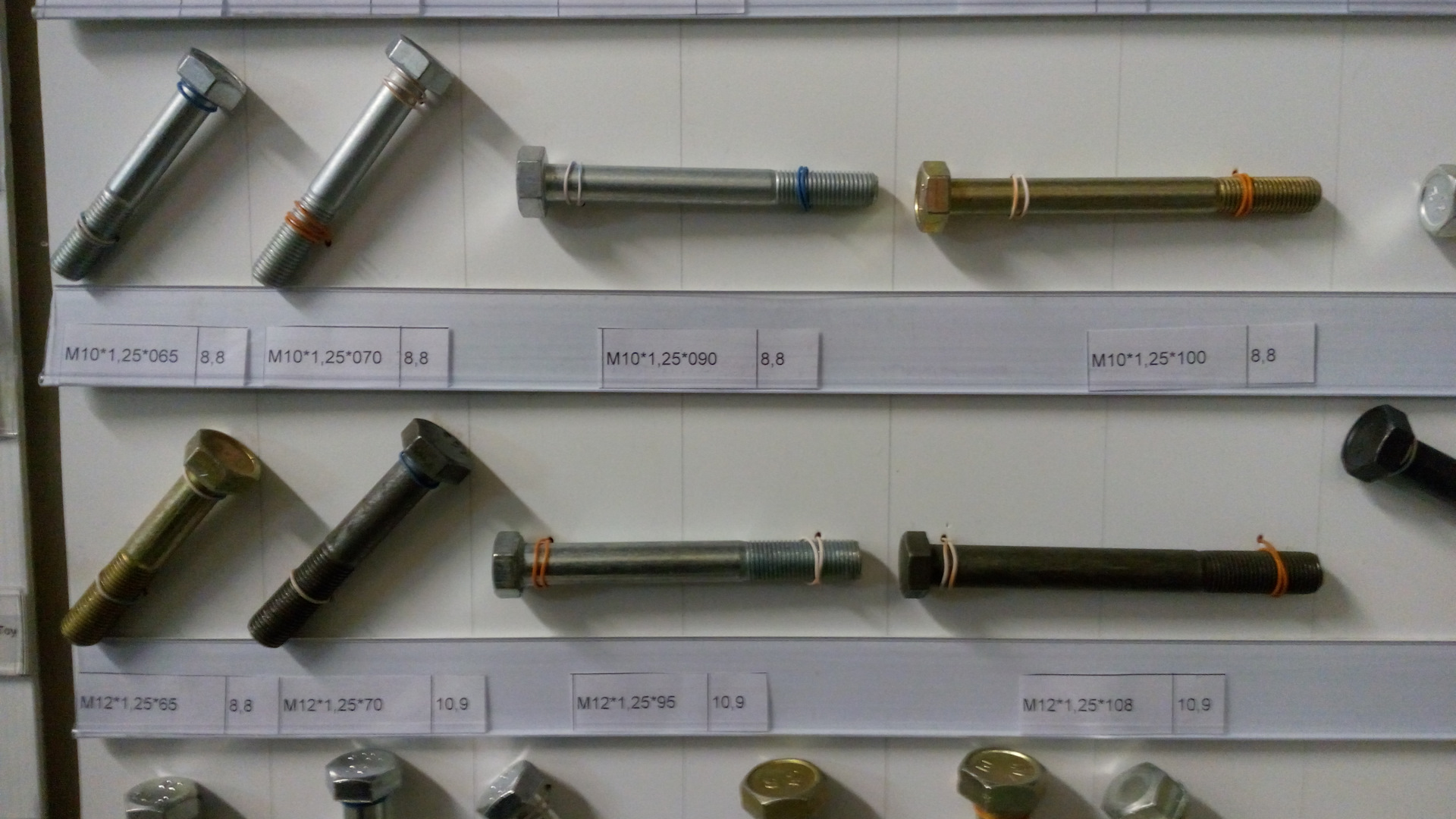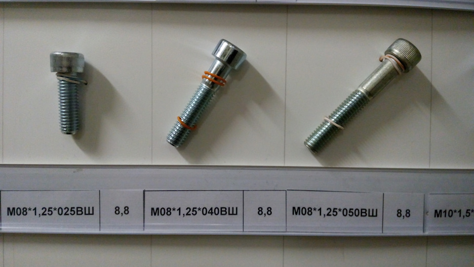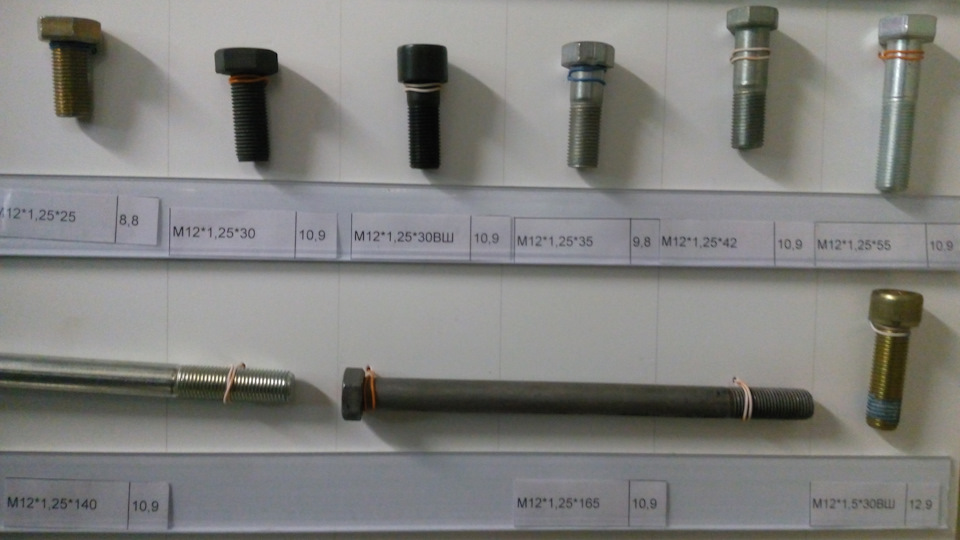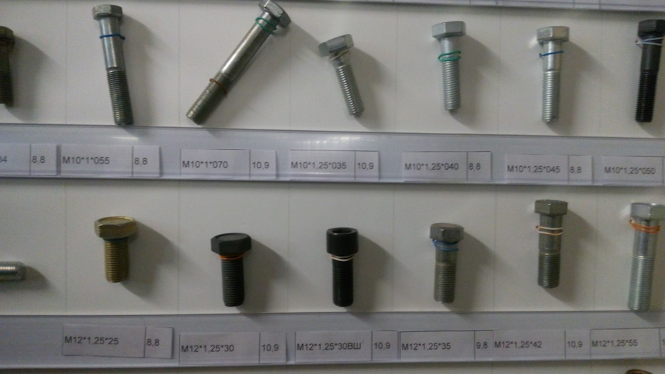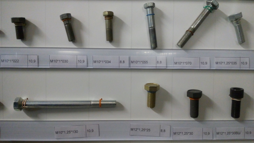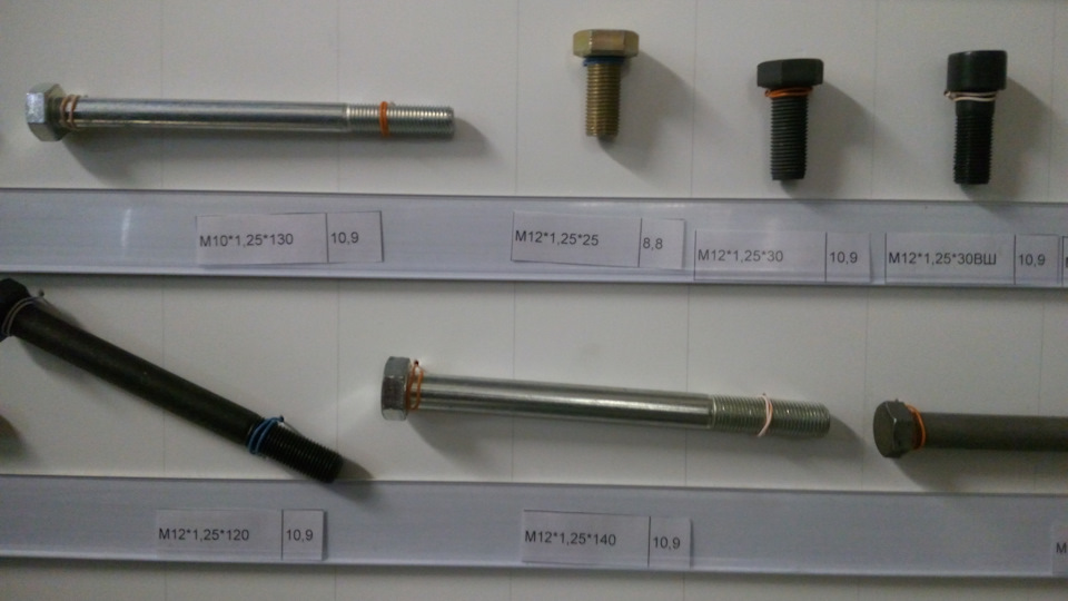 На фото, которые делал я со смартфона, крепеж только прочности от 8 до 12.9 с автомобилестроительной резьбой (в магазинах строительных метизов такие зачастую отсутствуют, так, строительный крепеж диаметром М12 и М14 резьба идет только с шагом 1.75, а надо 1.25 и 1.5). Прочность указана на наклейках. Указан и шаг резьбы и длина резьбовой части болта — от шляпки.