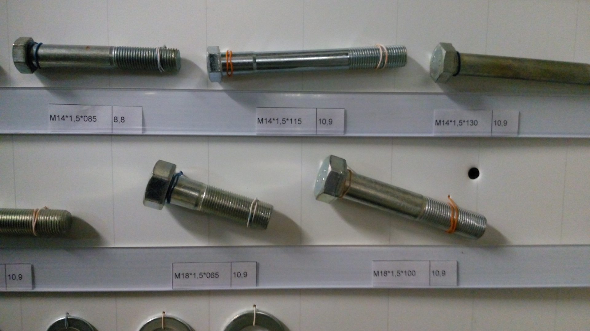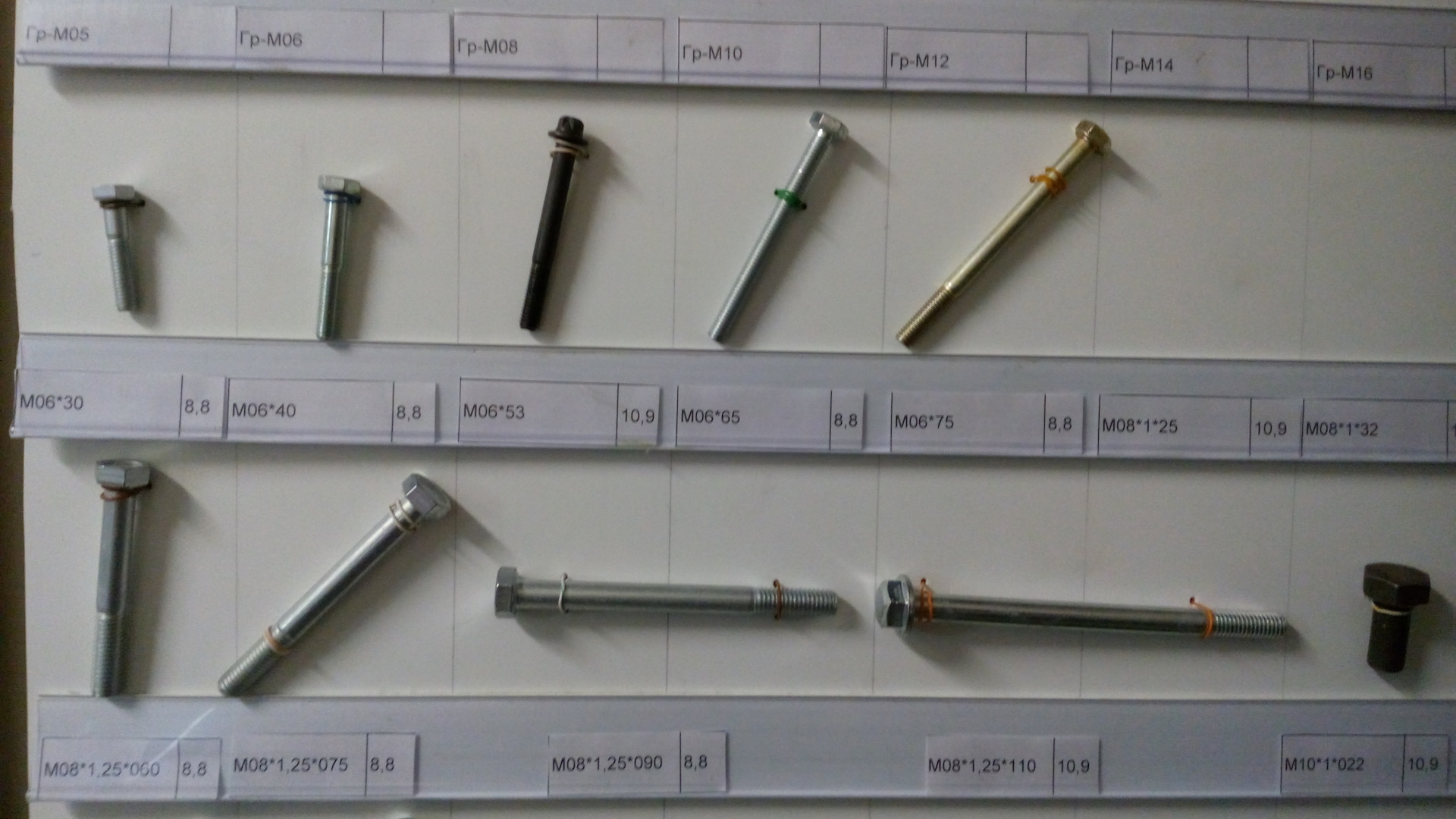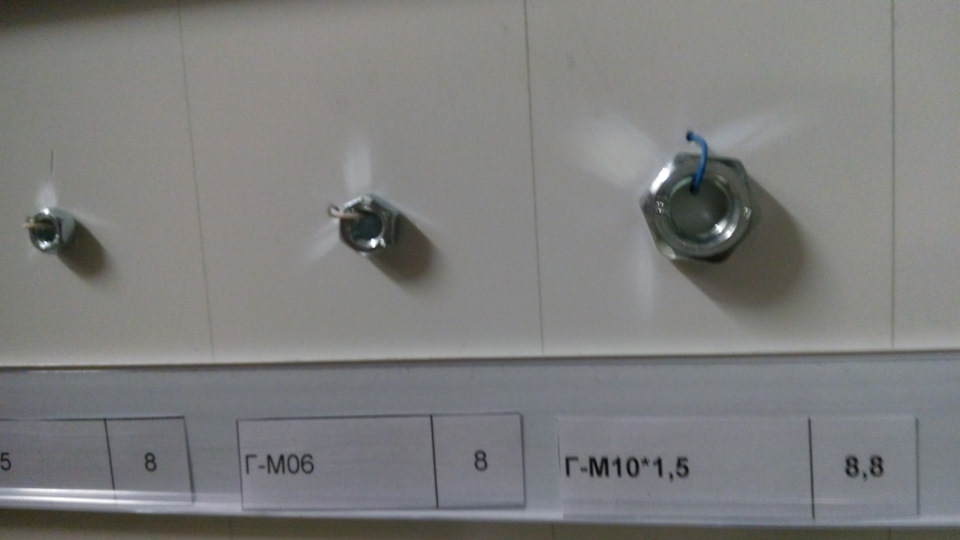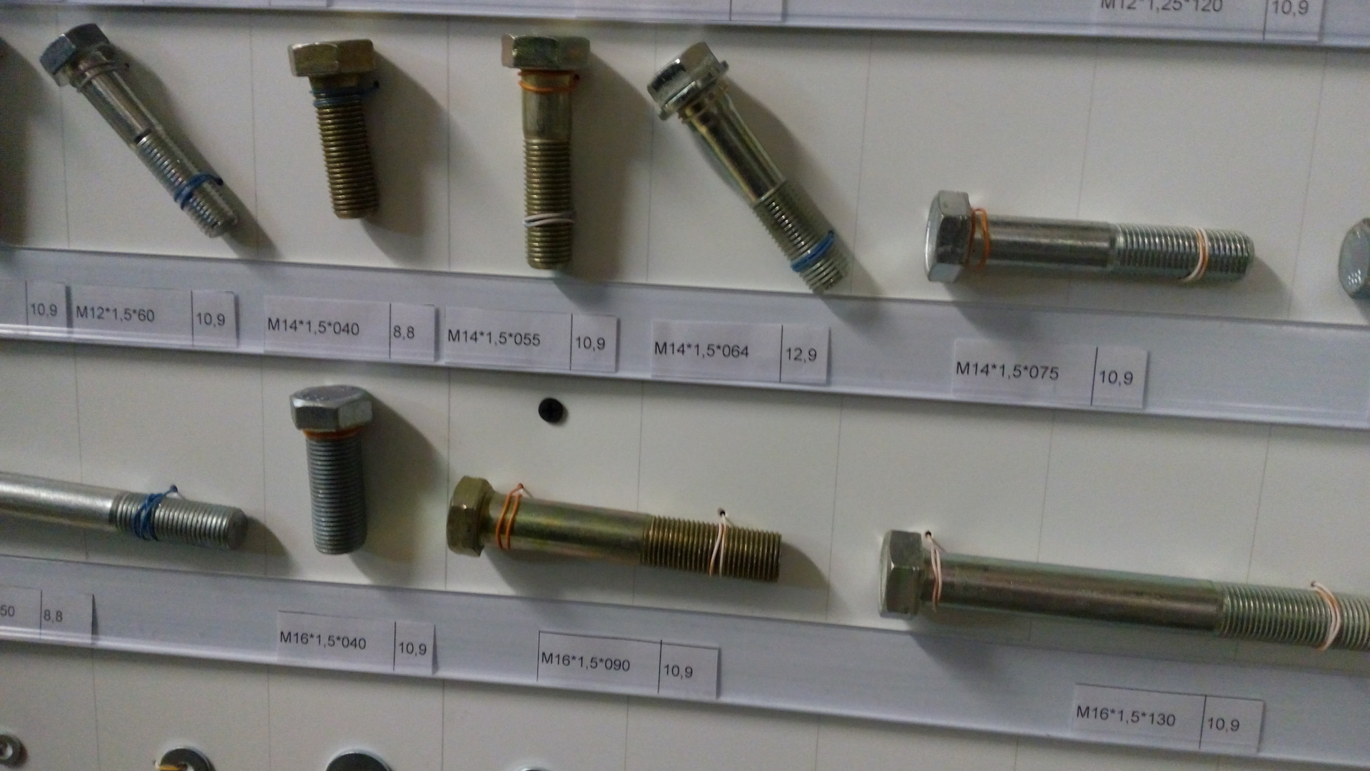 На фото, которые делал я со смартфона, крепеж только прочности от 8 до 12.9 с автомобилестроительной резьбой (в магазинах строительных метизов такие зачастую отсутствуют, так, строительный крепеж диаметром М12 и М14 резьба идет только с шагом 1.75, а надо 1.25 и 1.5). Прочность указана на наклейках. Указан и шаг резьбы и длина резьбовой части болта — от шляпки.