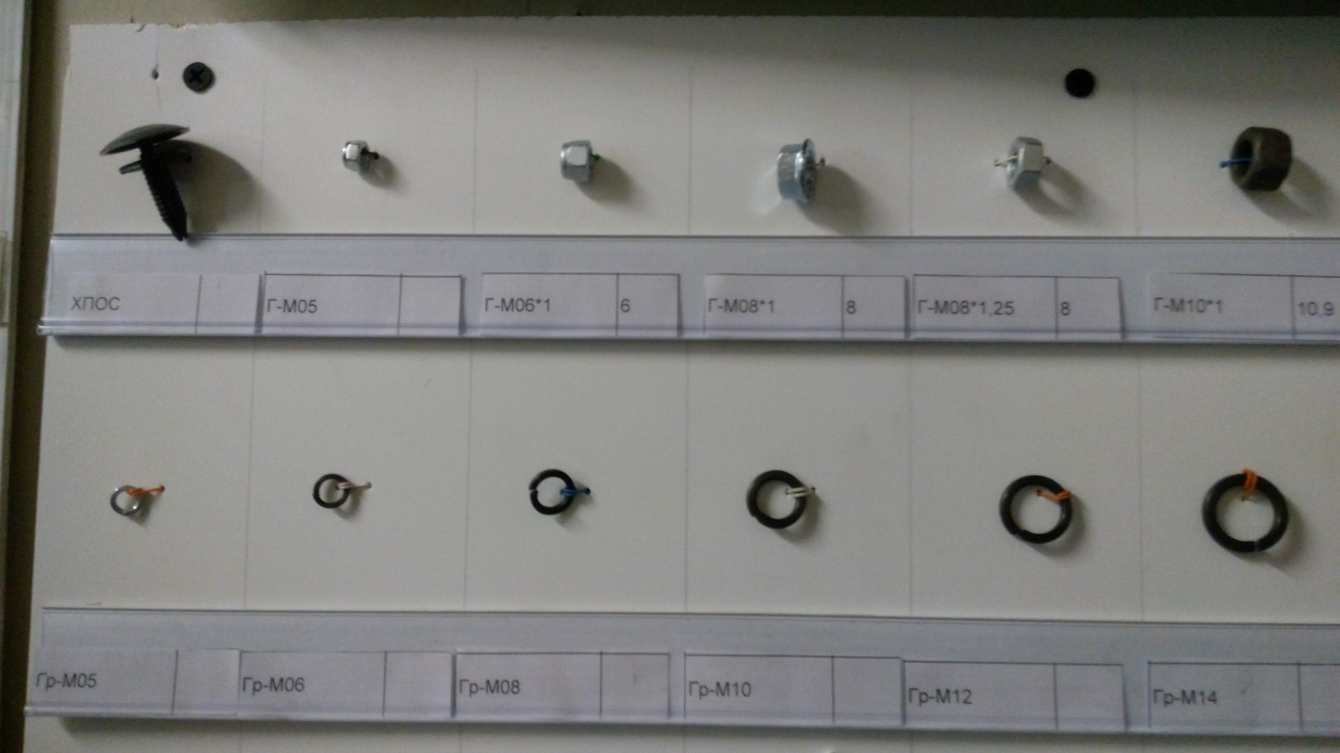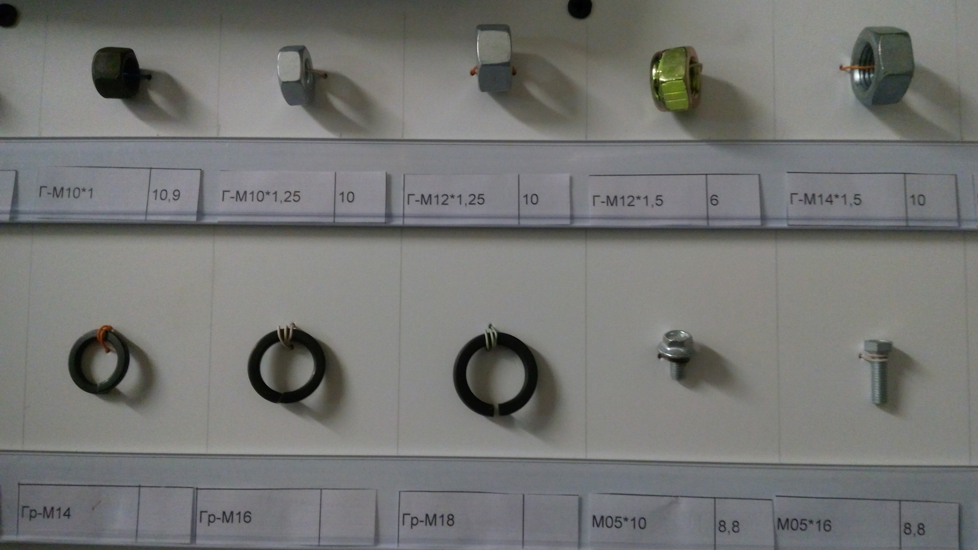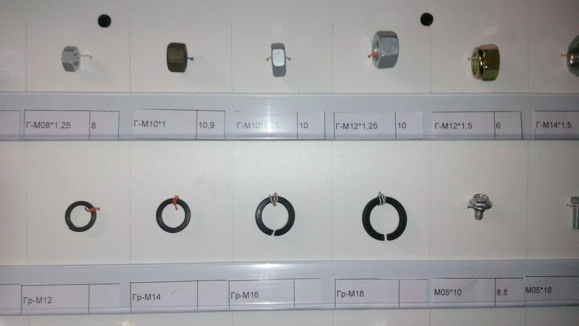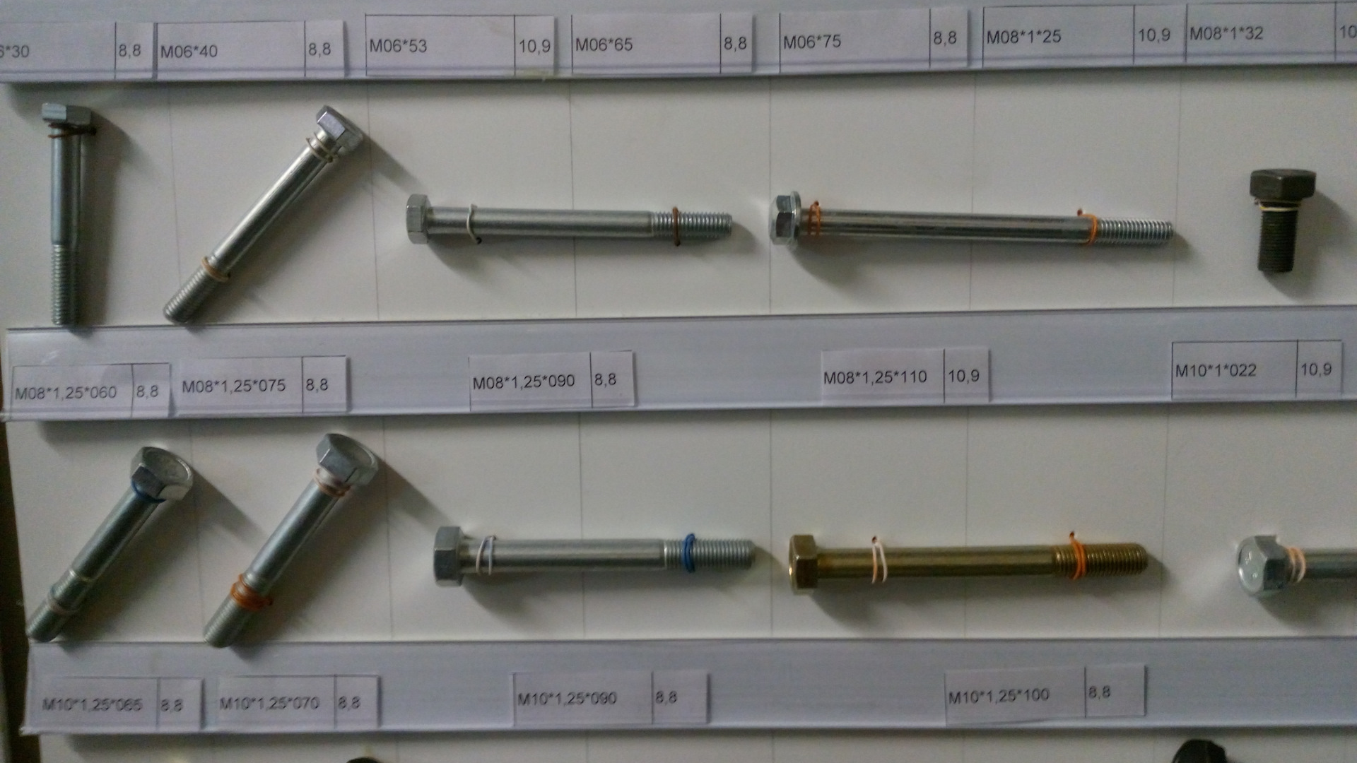 На фото, которые делал я со смартфона, крепеж только прочности от 8 до 12.9 с автомобилестроительной резьбой (в магазинах строительных метизов такие зачастую отсутствуют, так, строительный крепеж диаметром М12 и М14 резьба идет только с шагом 1.75, а надо 1.25 и 1.5). Прочность указана на наклейках. Указан и шаг резьбы и длина резьбовой части болта — от шляпки.