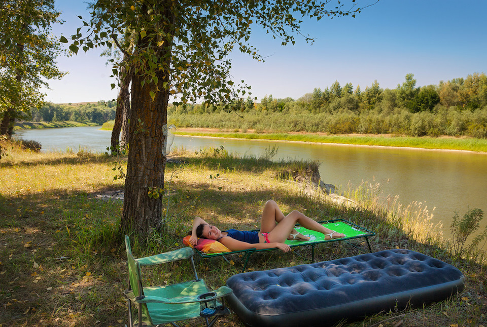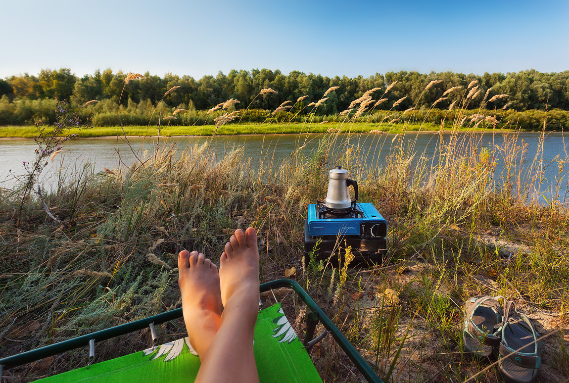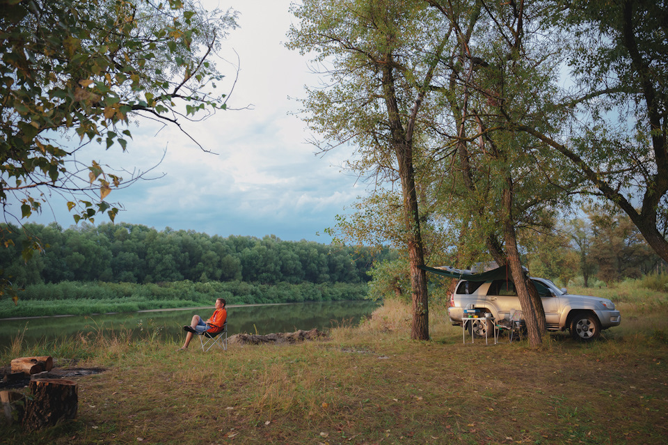 Если это вам удалось, то поздравляем! Вы насладитесь невероятной панорамой на реку Хопер и прилегающие территории золотых степей с зарослями дикой груши и яблони. По приезду разбиваем лагерь, до костра с шашлыком еще далеко, но чаю попить то можно? Для этого есть портативная плитка и раскладушка, на которой офигенно лежать прямо перед рекой и ожидать кружочку горячего напитка.