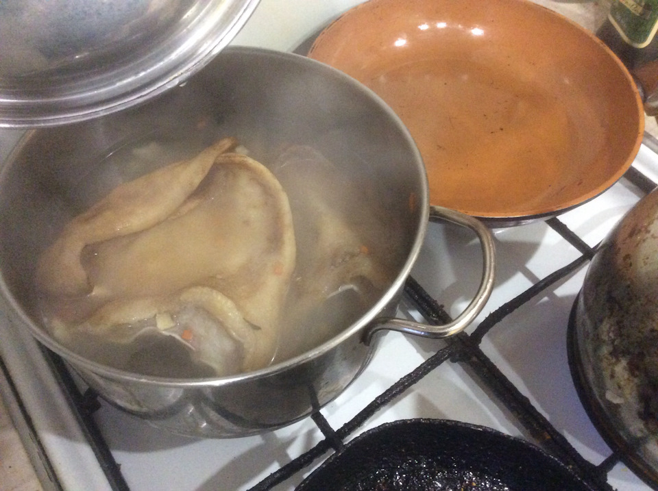 Дано: 4 хорошо вычищенная свиных уха, отрезал сам, чистил сам.