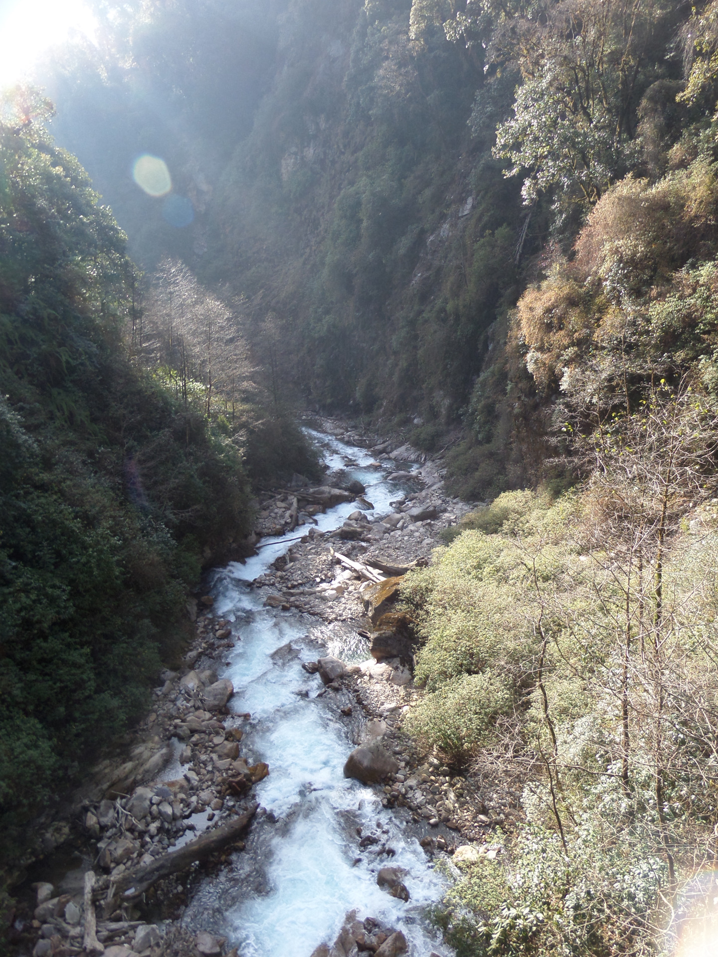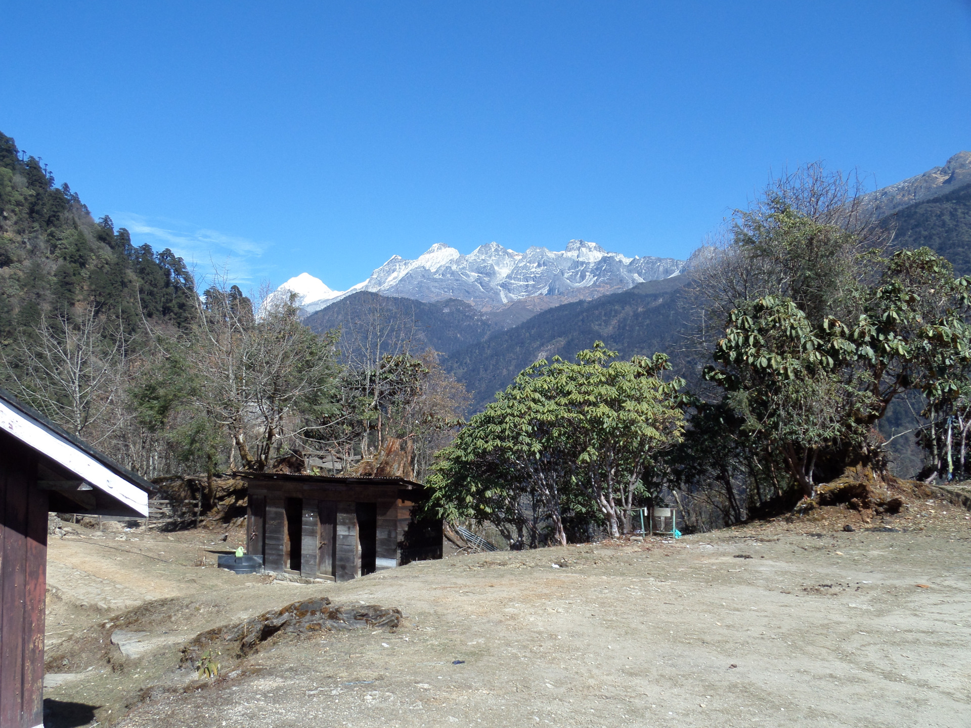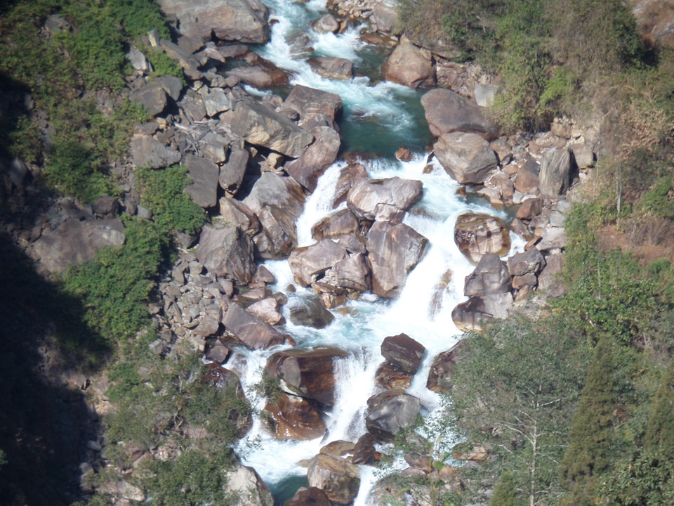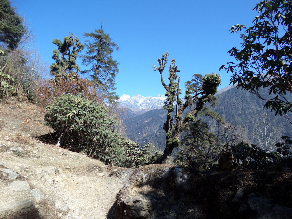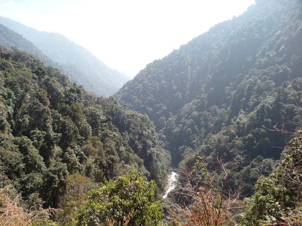 К вечеру (в 5 начинает садиться солнце, в 6 уже совсем темно), мы почти дошли до точки, которую я отметила у себя на карте как место для первой стоянки, но здесь были и удобная поляна и река, да и смеркаться начало, смысла идти дальше не было. За день было пройдено около 7 км и набрана высота — с 1739 до 2200 м. За ужином было принято решение — утром оставить основные рюкзаки в лагере и на легке максимально далеко пройти, чтобы все таки увидеть восьмитысячник. Наш расчет был оправдан и к трем часам второго дня, пройдя маршрут, рассчитанный на 2 дня )) мы дошли до того места, откуда хорошо видно место, с которого хорошо видно Канченжангу ))))
