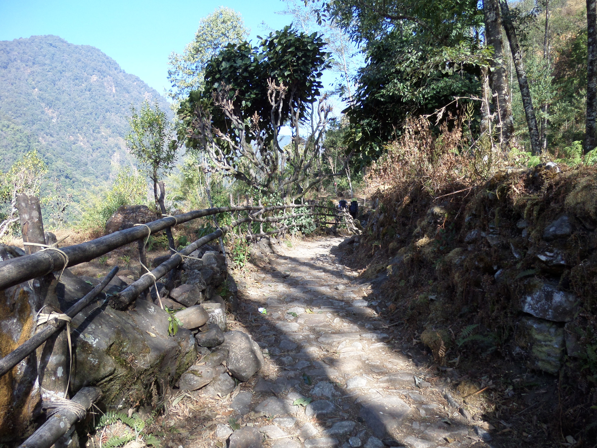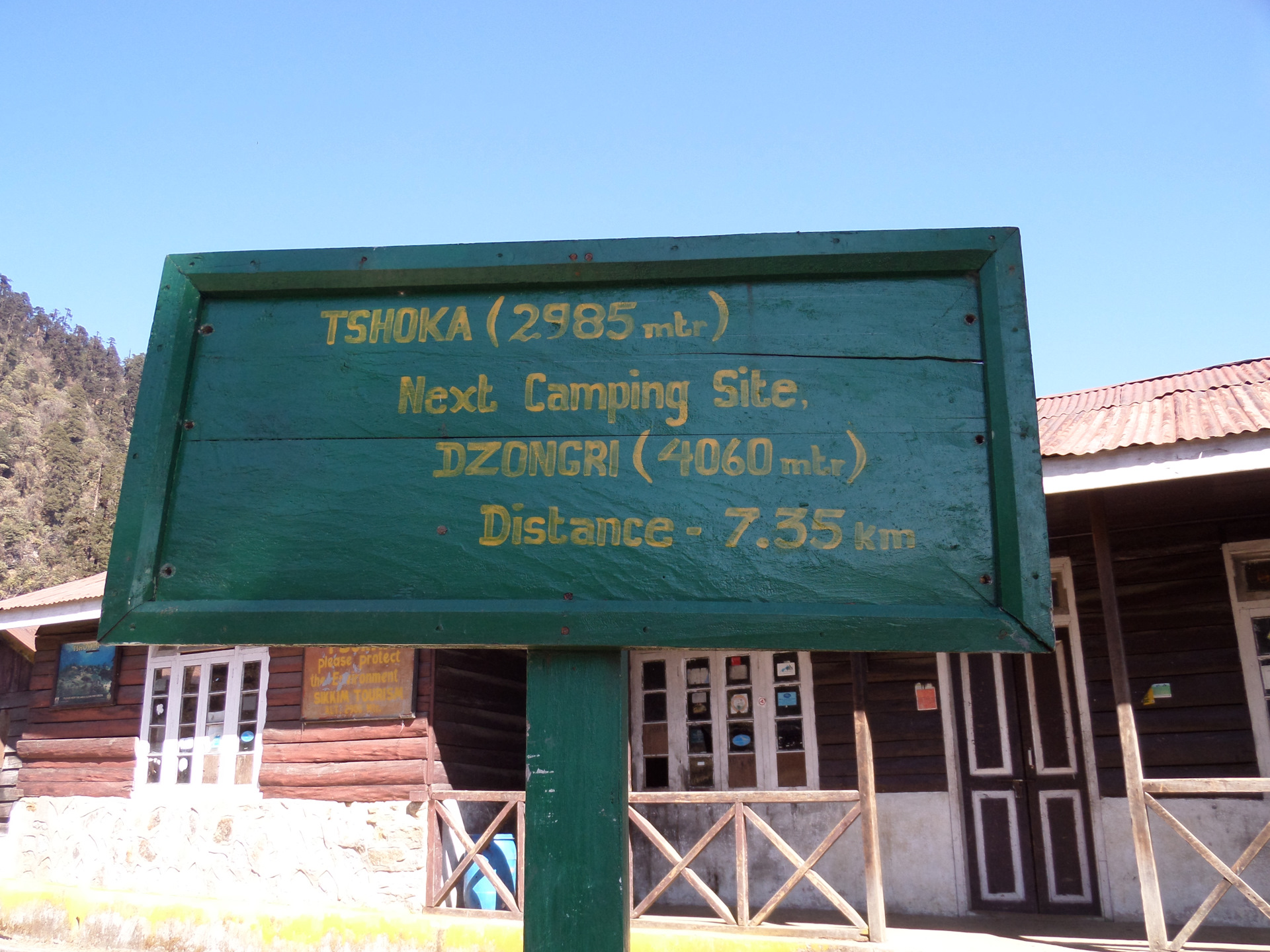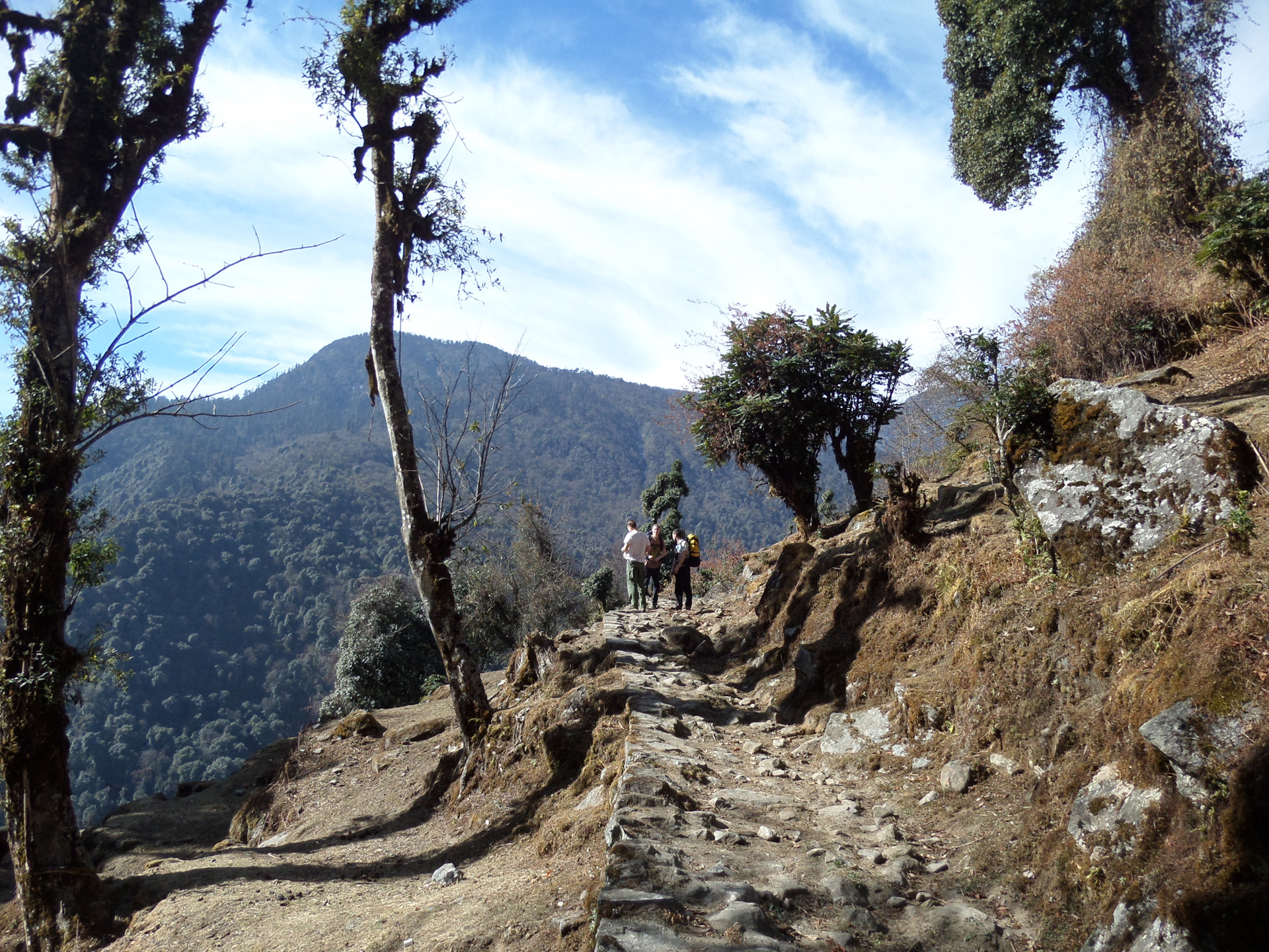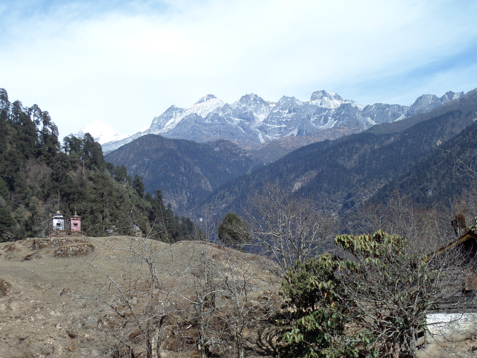 К вечеру (в 5 начинает садиться солнце, в 6 уже совсем темно), мы почти дошли до точки, которую я отметила у себя на карте как место для первой стоянки, но здесь были и удобная поляна и река, да и смеркаться начало, смысла идти дальше не было. За день было пройдено около 7 км и набрана высота — с 1739 до 2200 м. За ужином было принято решение — утром оставить основные рюкзаки в лагере и на легке максимально далеко пройти, чтобы все таки увидеть восьмитысячник. Наш расчет был оправдан и к трем часам второго дня, пройдя маршрут, рассчитанный на 2 дня )) мы дошли до того места, откуда хорошо видно место, с которого хорошо видно Канченжангу ))))