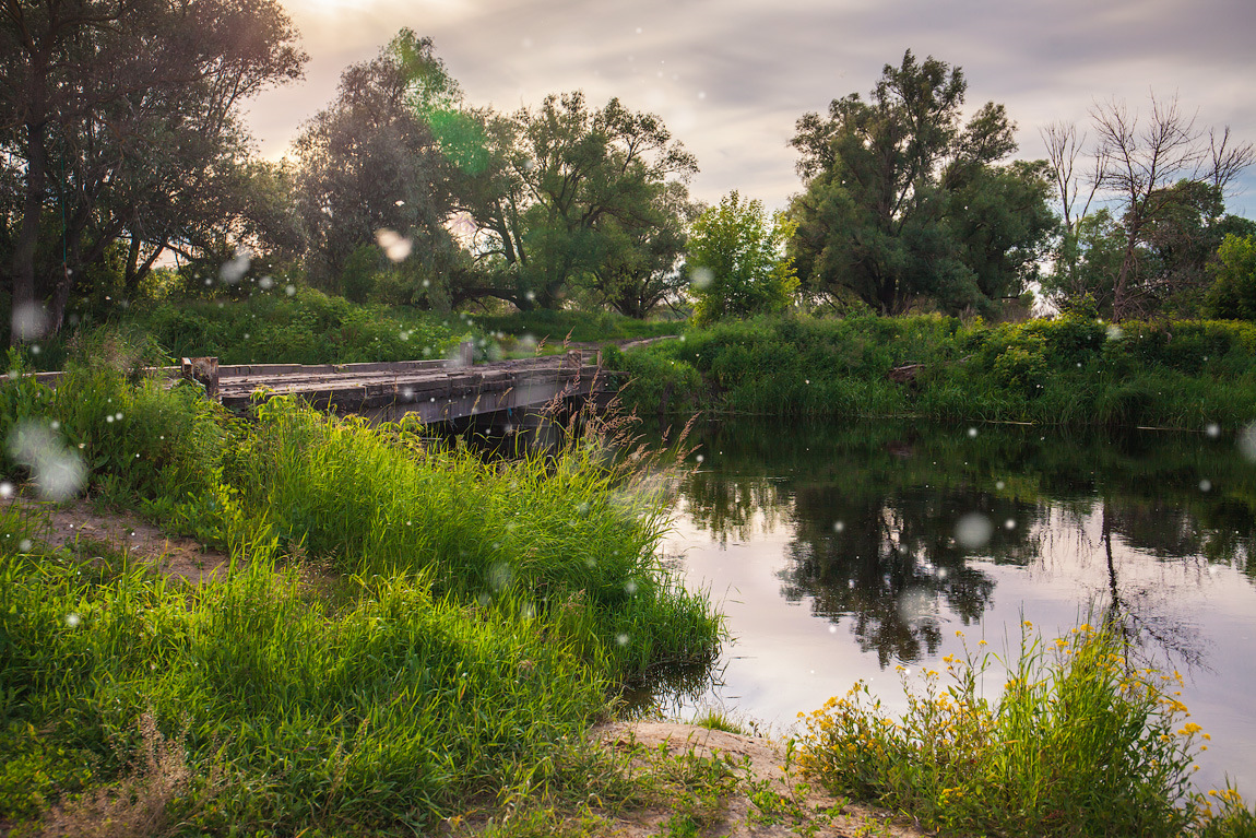 Дальше возвращаемся на Острогожскую трассу, едем в сторону Коротояка. А от села двигаемся по грунтовой дороге, вздымая клубы пыли прямо к мосту через реку Тихая сосна. Здесь, как будто время остановилось, течение реки плавное, вечереет, только легкий пух деревьев медленно летает в воздухе, пронизанный солнечным светом.