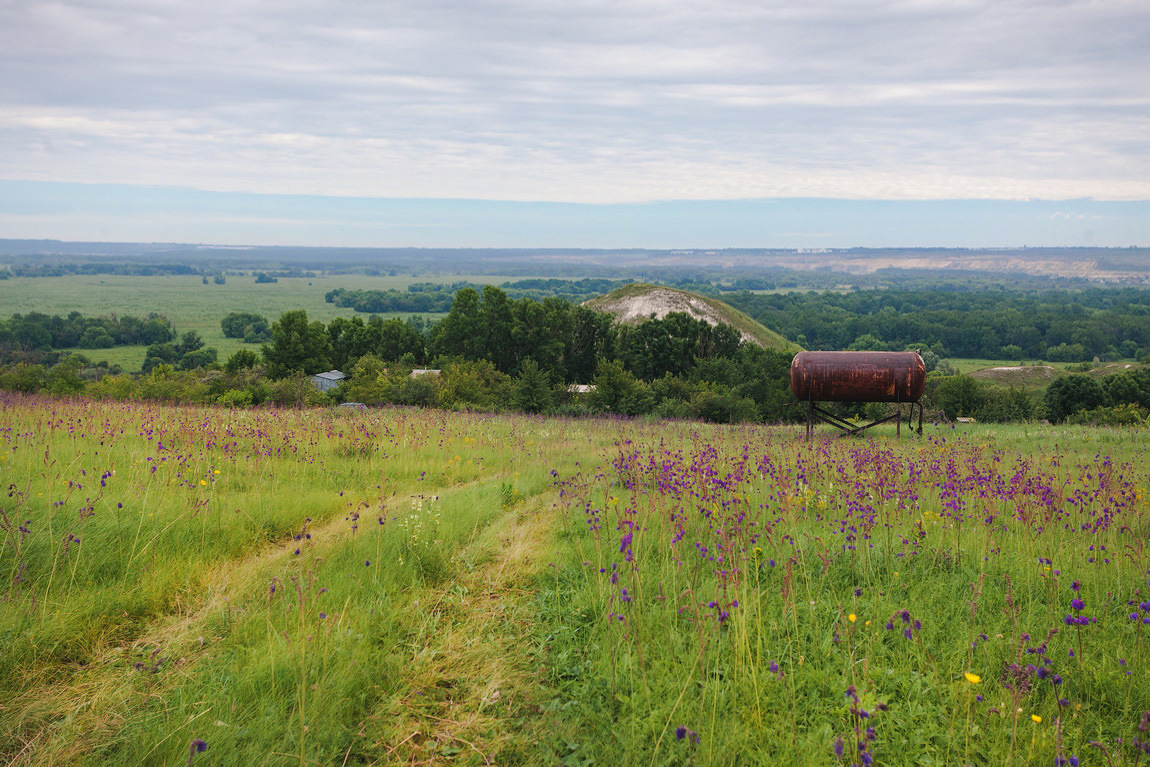 Погодка заметно подпортилась, солнца в этот день не предвиделось. Ночью моросил дождь, трава стала мокрой, а резкий спуск с холма, который ведет к Шатрищу был полностью из вязкого чернозема и глины, изрытый оврагами — даже если и спустишься, то подняться по скользкой жиже было бы нереально без лебедки. А у нас ее нет. Оставляем машину на цветущим ароматном лугу, идем пешком до горы. Обратите внимание на железную бочку, она понадобится потом, как ориентир на следующих фото.