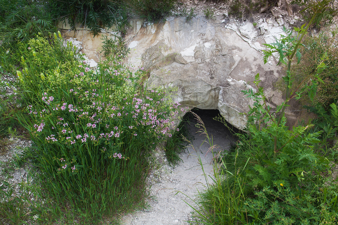 А знаете, чем еще удивительна это гора? Это не только меловой останец, но и объект культурного наследия регионального значения. Почему? Потому что в недрах останца расположена Шатрищегорская пещера — христианский рукотворный объект, часть разрушенного в ХХ веке почитаемого пещерного комплекса. Искусственная Шатрищегорская пещера вскрывает естественную полость, крупнейшую в Воронежской области. Их суммарная длина составляет 325 м. Спускаясь обратно мы нашли один из входов в нее.