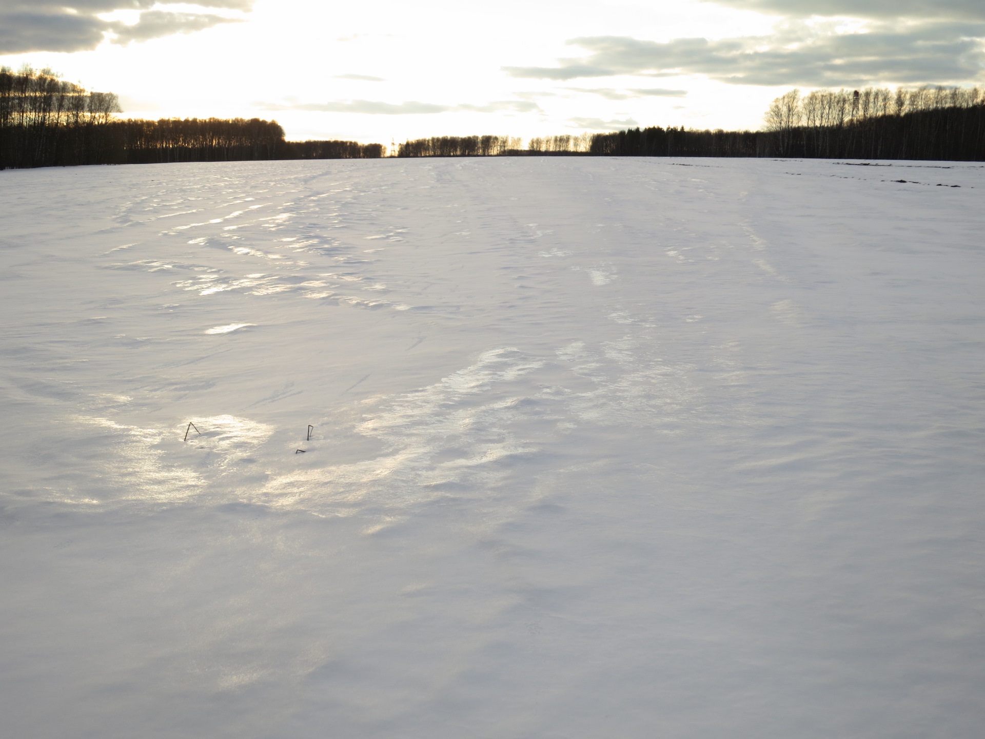 Собственно, короткий перелесок привел нас к полю. На опушке леса сплошной снежный покров стал совсем непреодолимым. В некоторых местах наст позволял стоять на нем и не проваливаться, но если провалиться — то до колен.